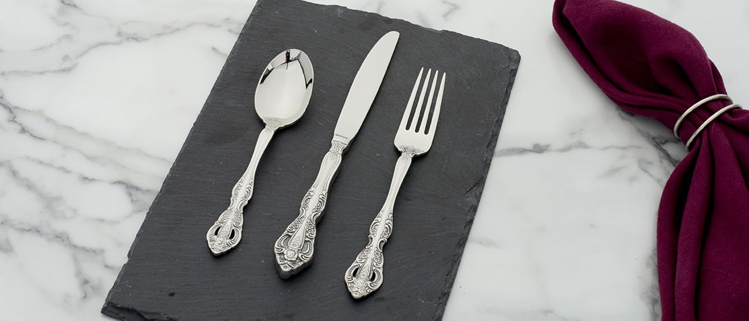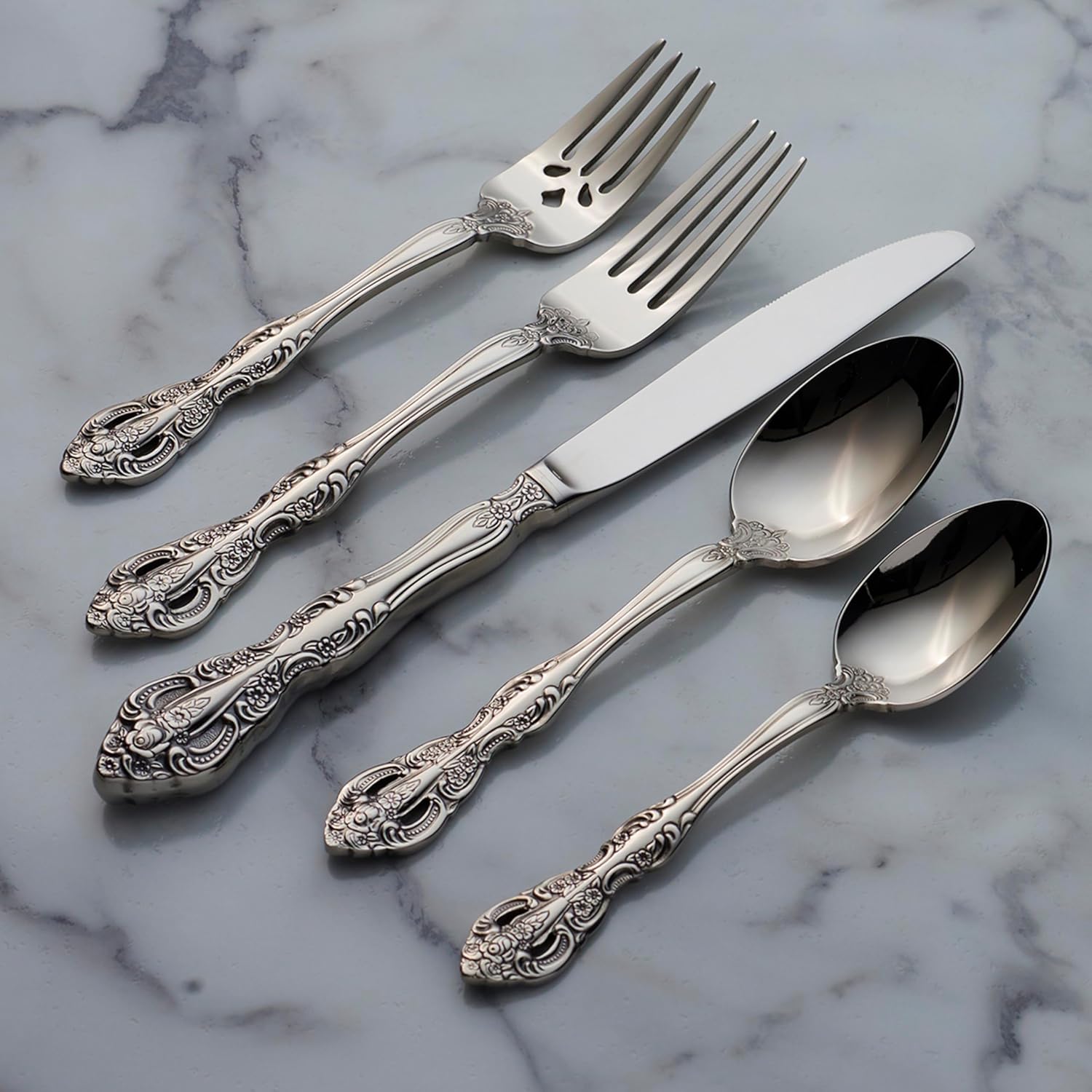 - 5-piece flatware set with service for 1. Set includes 1 each: salad/dessert fork, place fork, place knife, place spoon, and teaspoon