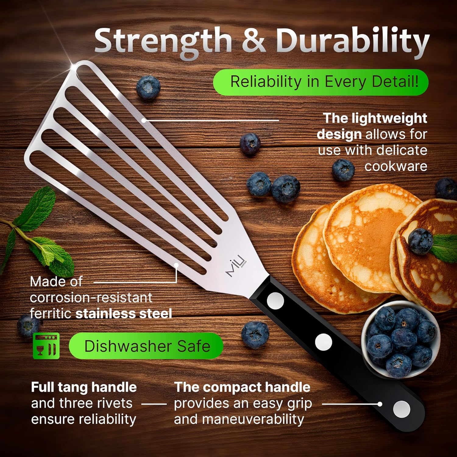 - Holds Hefty Food with Ease β our metal turner can be used at barbecue party to make burgers on an outdoor grill as it can easily hold the weight of a half-pound patty