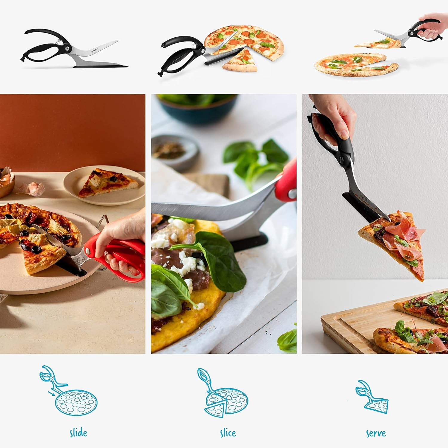 - SLIDE, SLICE, SERVE | Pizza wheels don’t dream big enough. The Scizza comes with a unique spatula shoe that acts as a pizza server as well. Just slide it under your pizza, slice, pinch, pull and serve. Heat resistant to 400°F