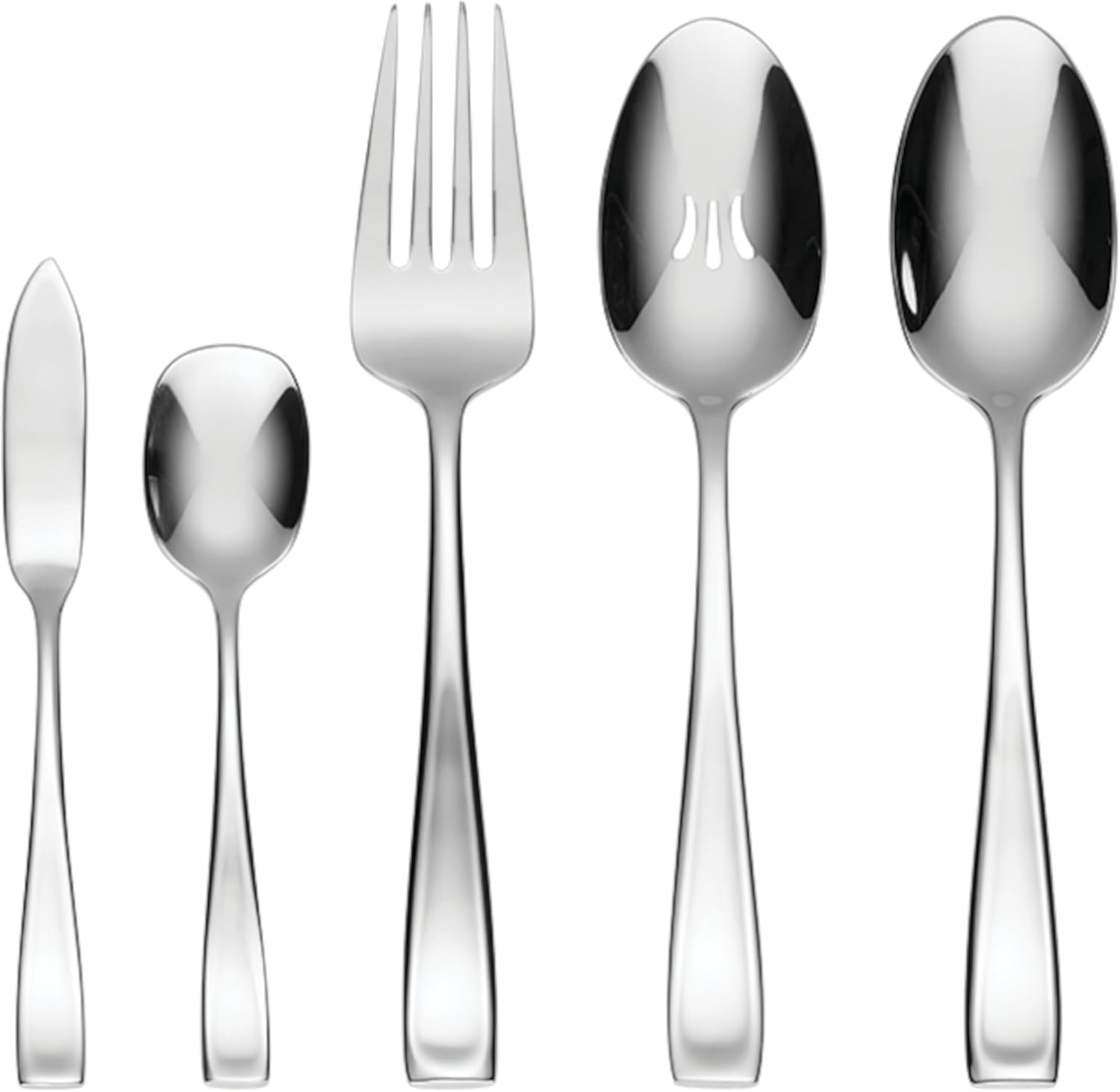 - WHAT'S IN THE BOX: Includes a 65-piece flatware set for 12 people, plus a 5-piece serving set. Each of the 12 flatware place settings includes a dinner fork, salad fork, dinner knife, dinner spoon, and teaspoon. Serving set includes a serving spoon, pierced serving spoon, sugar spoon, butter knife, and serving fork.