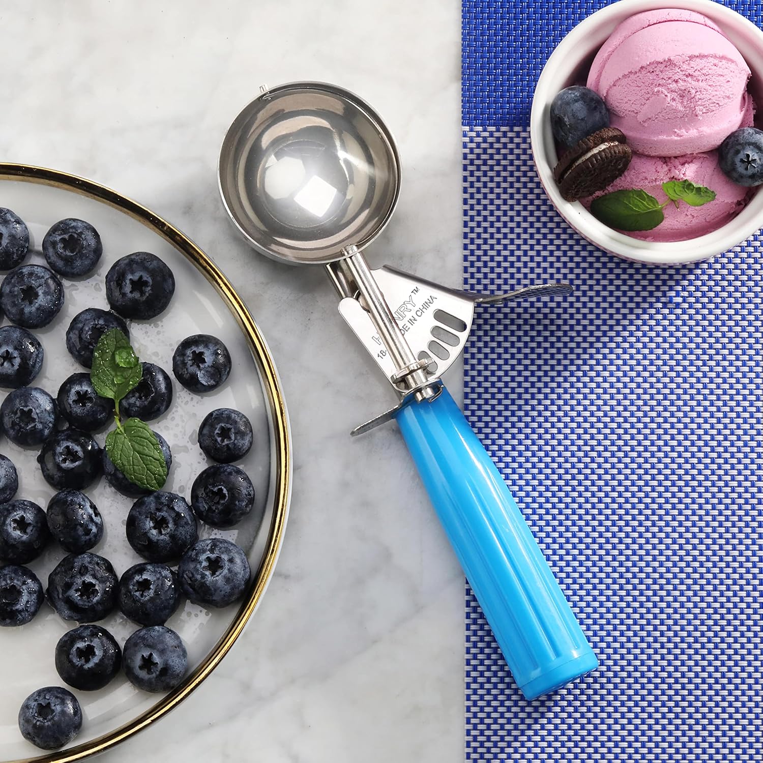 New Star Foodservice 34820 Commercial-Grade Thumb Press Food Disher/Ice Cream Scoop, 18/8 Stainless Steel, 2.75 oz, Size 16, Blue