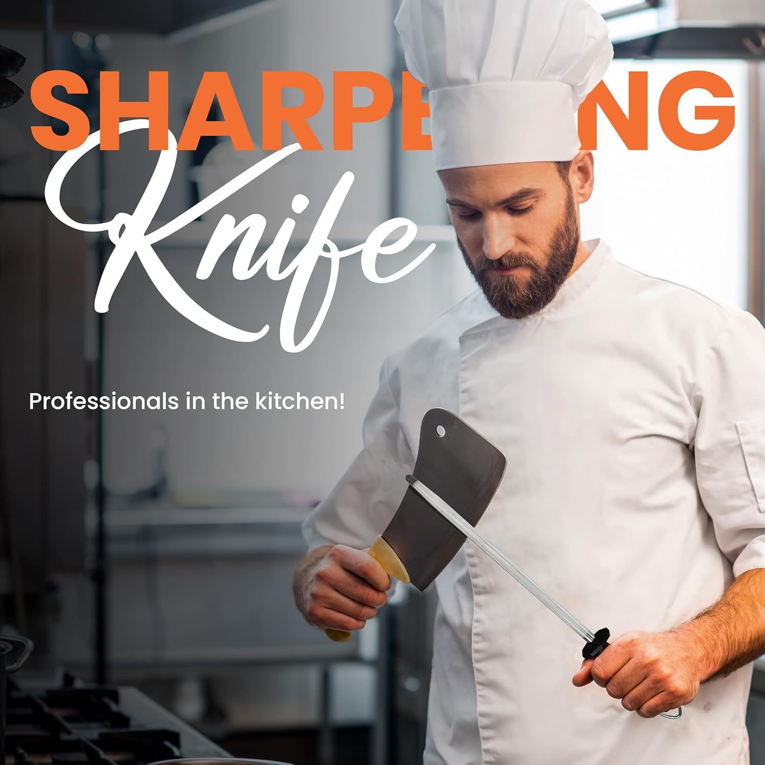 - Versatile Compatibility - Our knife sharpening steel rod is for all types of knives, including kitchen, household, sporting and pocketknives; sharpens standard and serrated edge knives. Restores dull knives to razor-sharp perfection with ease.