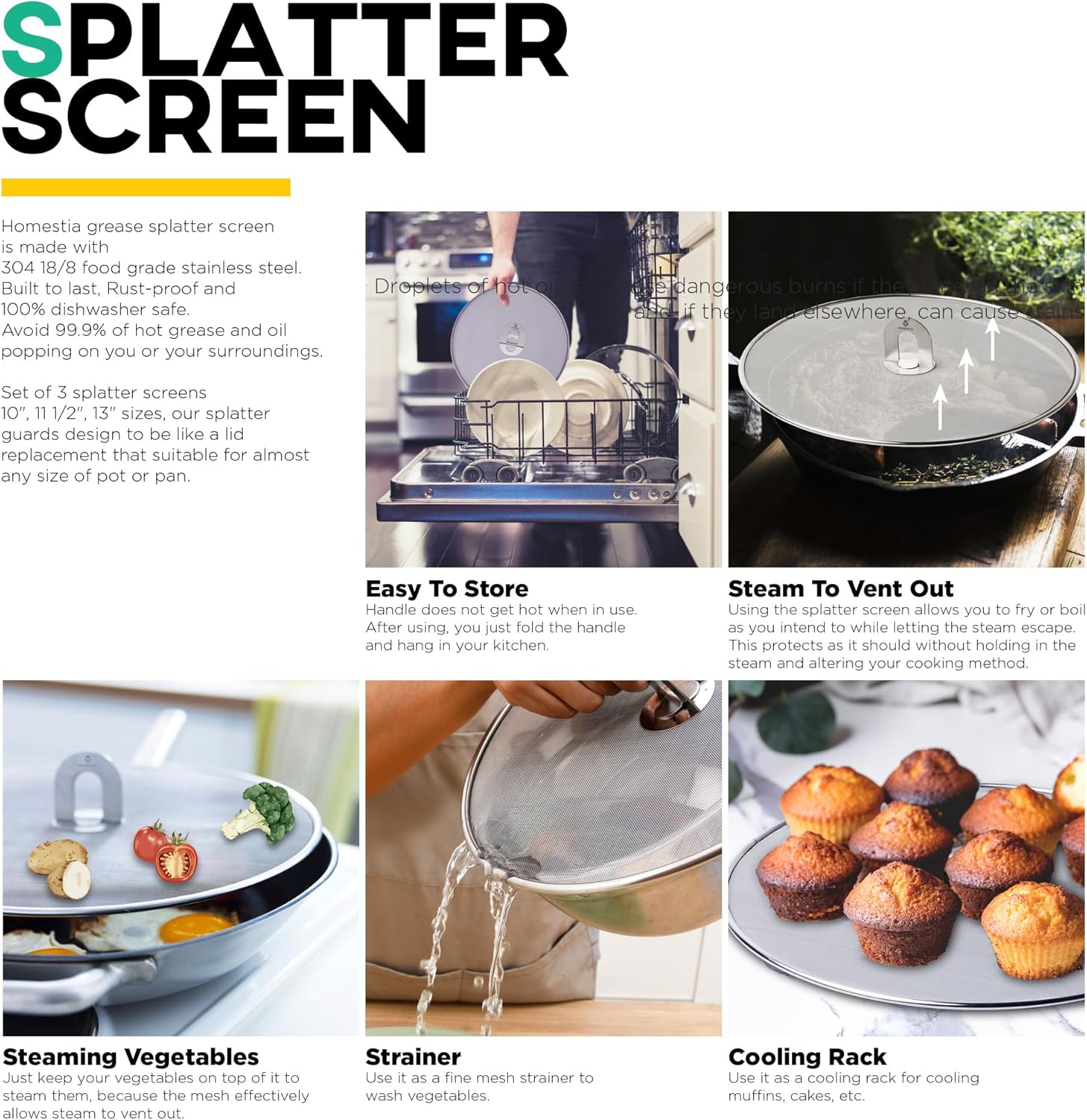 - MULTIFUNCTON: The splatter screens are super helpful when cooking pork chops, frying bacon, letting sauces simmer, frying eggs, and more, The splatter screens can also be used for draining and straining pans, to steam vegetables on top if it while cooking or as a cooling rack for cupcakes and cookies.