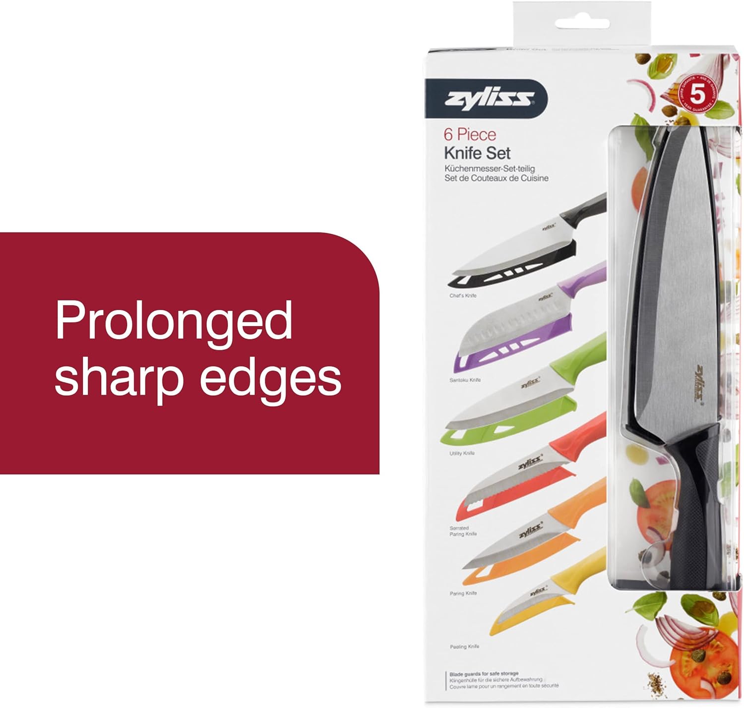 Zyliss 6 Piece Knife Value Set - Kitchen Knife Set with Sheath Covers - Chef's, Santoku, Utility, Serrated Paring, Paring & Peeling Knives - Stainless Steel
