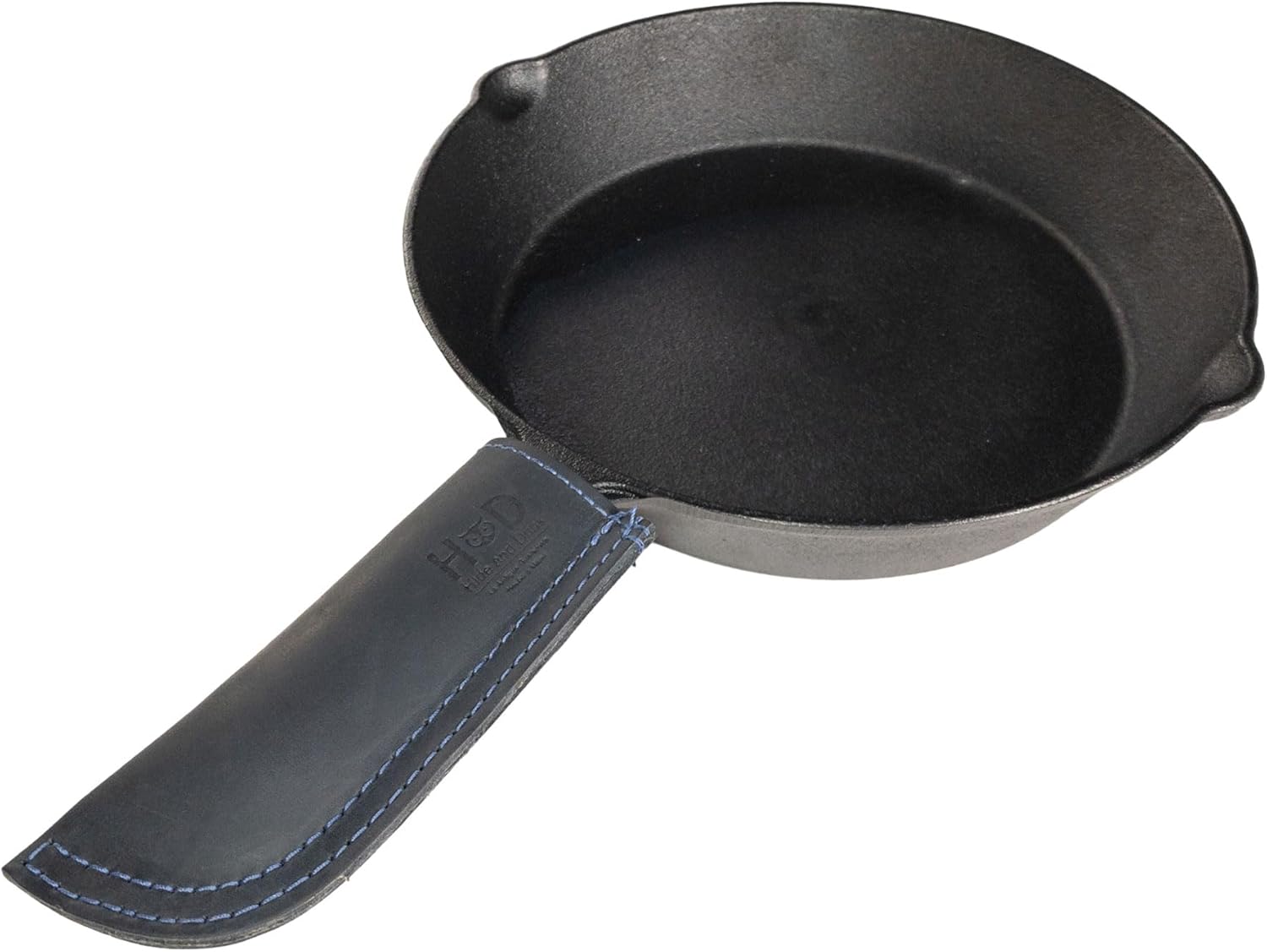 - DURABLE DOUBLE LEATHER LAYER OFFERS PROTECTION UP TO 450-DEGREES: The double layered leather provides excellent insulation to prevent any burns as you take the Skillet off the fire, giving you a protection against high temperatures. Note that these Rustic Leather Pan handles are designed for levels of heat-proofing, they are not fireproof β do not place in the oven.