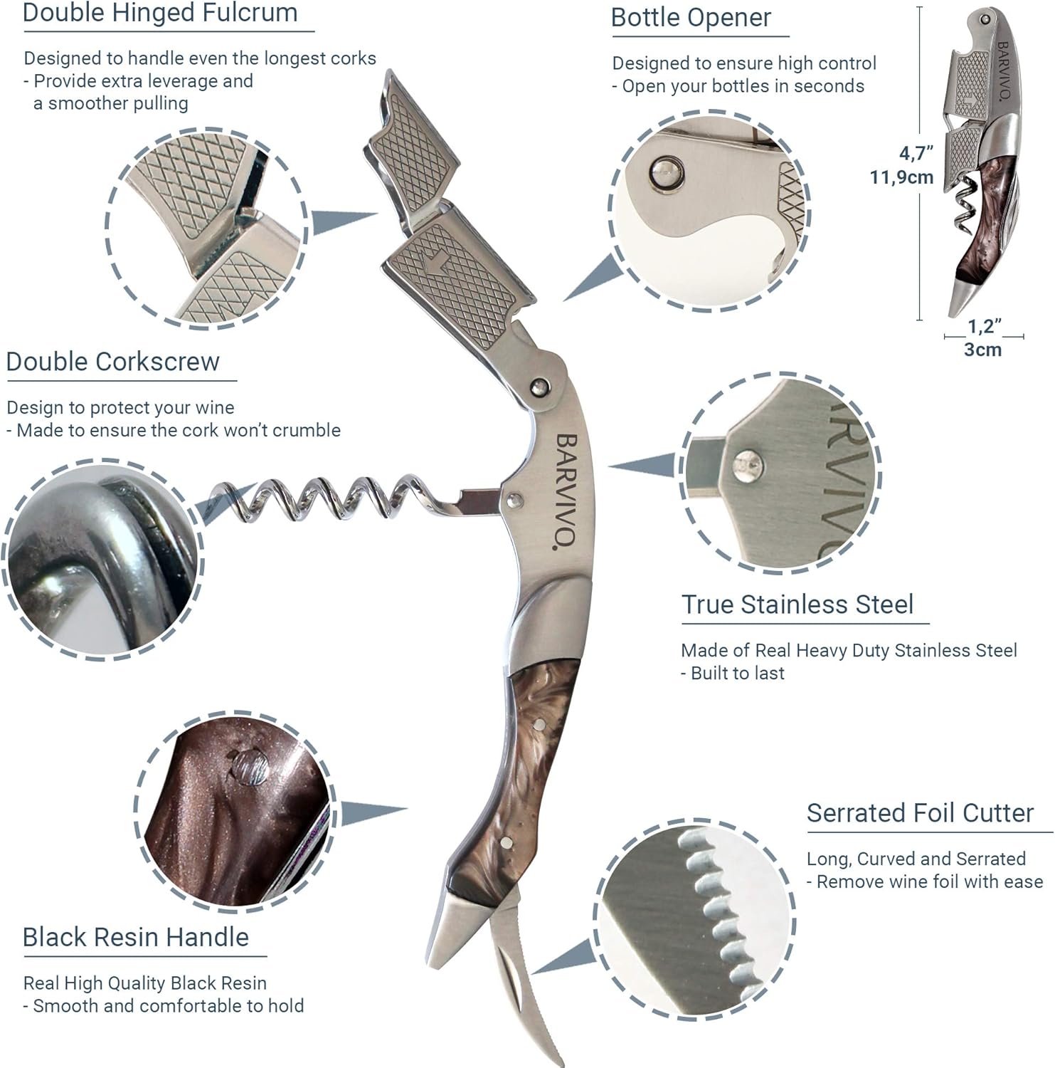 Barvivo Black Resin Wine Opener with Foil Cutter Knife and Cap Remover, Double Hinged Manual Wine Key for Bartenders, Servers, Waiters, Stainless Steel Wine Bottle Opener Corkscrew