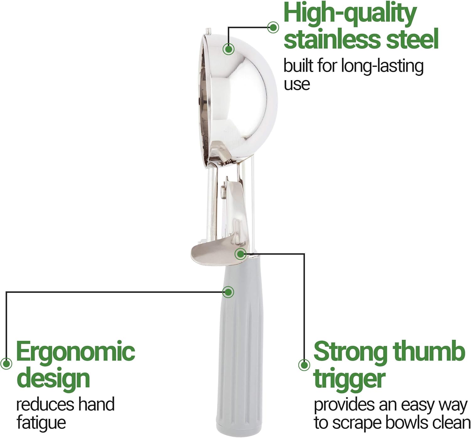 - COMFORTABLE USE: Reduce hand fatigue! This cookie dough scoop has a lightweight handle for a comfortable grip and a quick trigger release to smoothly dispense gelato, cookie dough, and more.