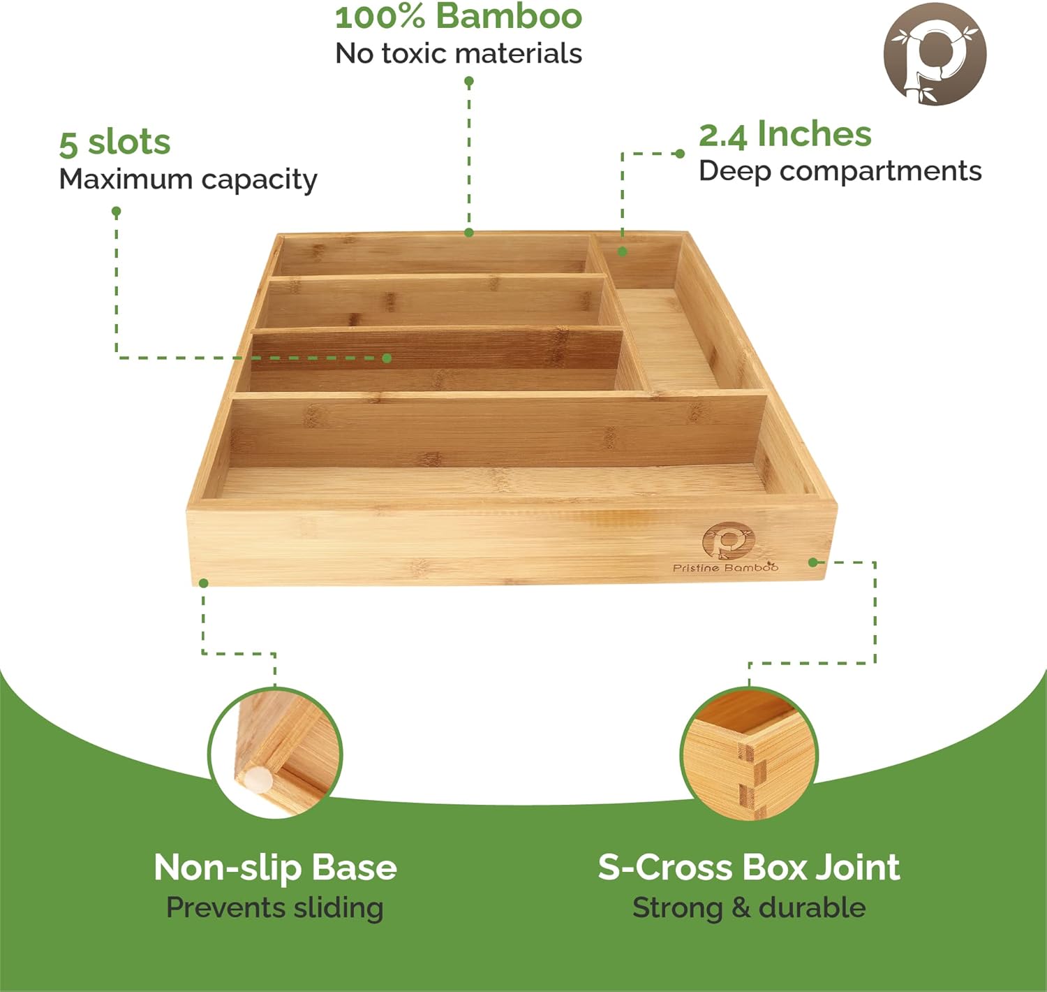 - SLIP RESISTANT & DEEPEST in the market: The only silverware drawer organizer that is slip-resistant and 2.4" deep. This deep silverware tray Increases storage capacity in your kitchen drawer to best fit a variety of utensils (internal depth 2β). The non-slip silicone feet keep your bamboo utensil holder in place. So donβt worry, your flatware organizer tray will not move to the back of the drawer ever.
