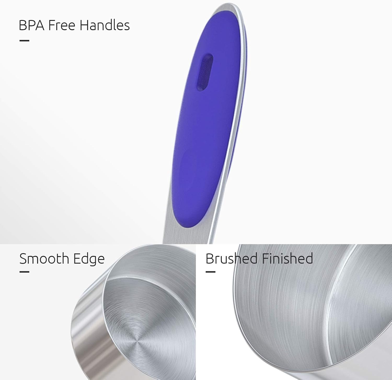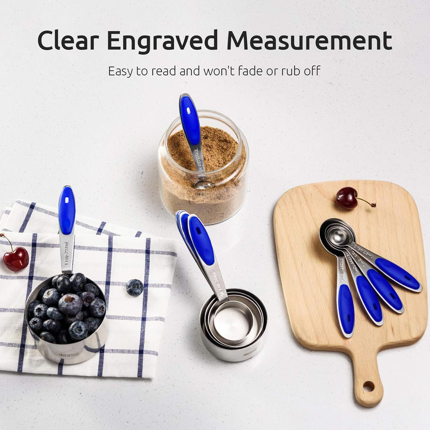 - [Engraved measurement will never rub off] If you are bothered by painted measurement (easy to fade) like 16.29% persons point out, you can choose our engraved metric measurements which is easy to read and will not rub off. To ensure accurate measuring in cooking/baking, this measuring cup set includes 1/8 cup, 1/4 cup, 1/3 cup, 1/2 cup, 1 cup and 1/4 tsp, 1/2 tsp, 1 tsp, 1/2 tbsp, 1 tbsp.