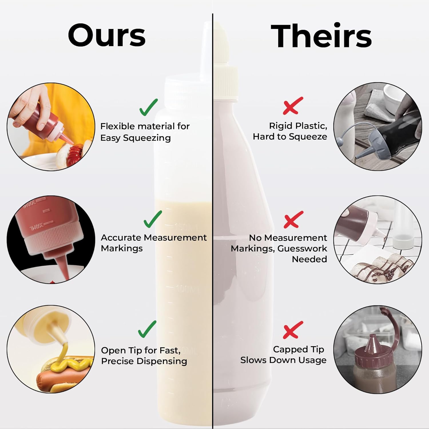 - TRANSLUCENT CONTAINER: This plastic squeeze bottle is translucent in color so you and your guests can easily identify the condiments. It's also a helpful indicator of when it's time to refill.