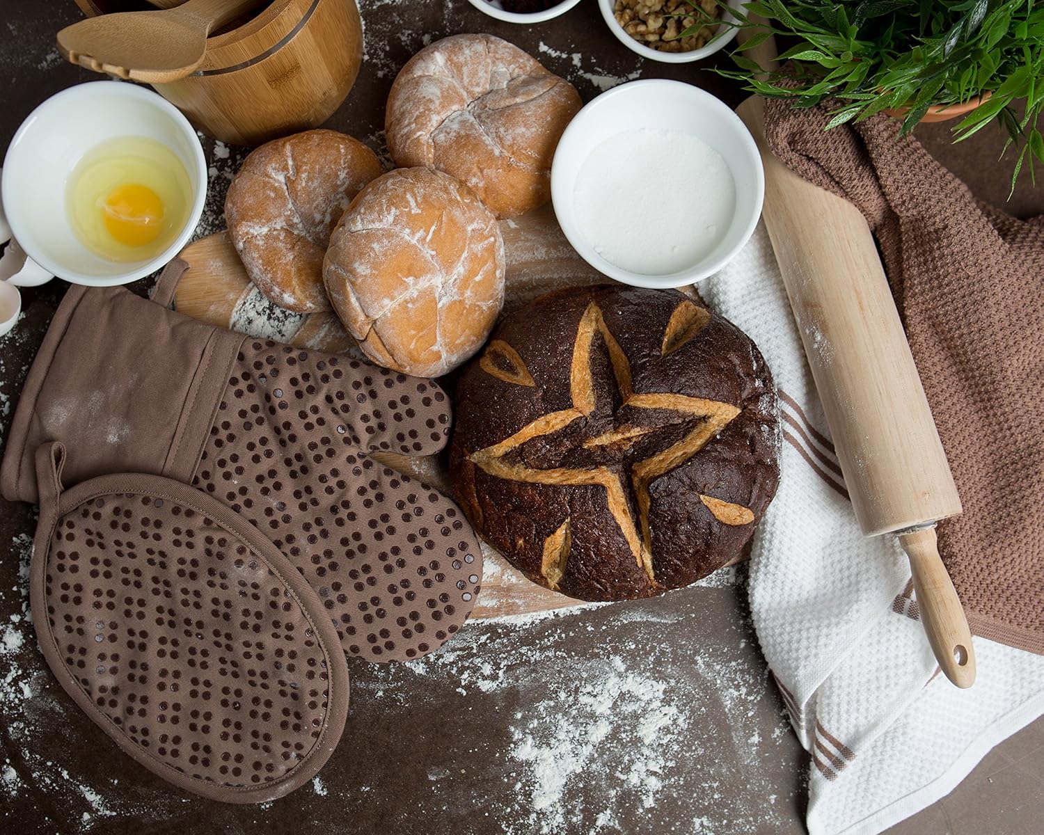 Sticky Toffee 9-Piece Kitchen Set – Brown 100% Cotton Terry Dish Towels, Dishcloths, Oven Mitts, and Pot Holders with Non-Slip Silicone Grip, Oeko-Tex Cotton