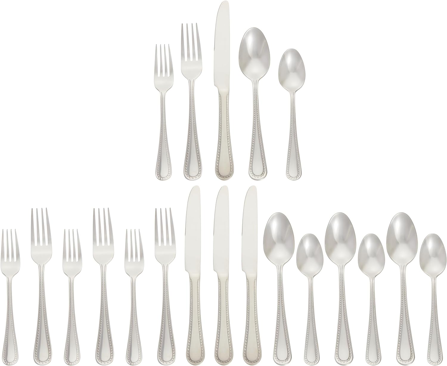 Amazon Basics Silverware Set, Stainless Steel Flatware, Dishwasher Safe, Service for 4, 20-Piece Forks and Spoons, Pearled Edge