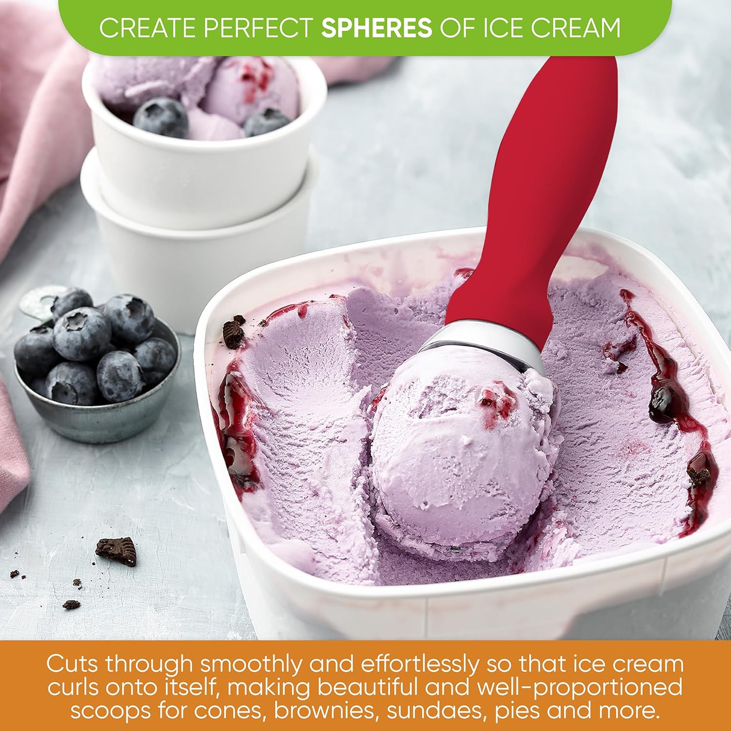 - Create Perfect Spheres Of Ice Cream - Cuts through smoothly and effortlessly so that ice cream curls onto itself, making beautiful and well-proportioned scoops for cones, brownies, sundaes, pies and more.
