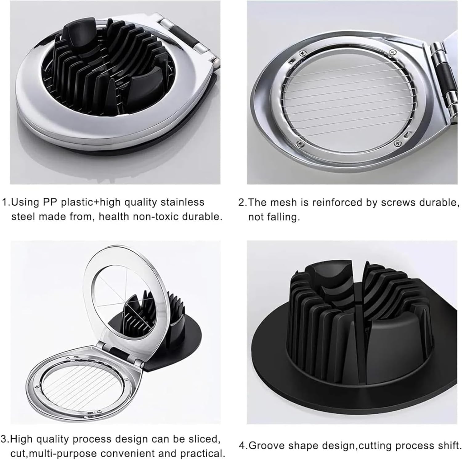 - Chrome-plated zinc Materials: It made of durable chrome-plated zinc. The cutting wires are constructed from stainless steel. It can easily to cut a hard-boiled egg into slices, wedges or egg dices