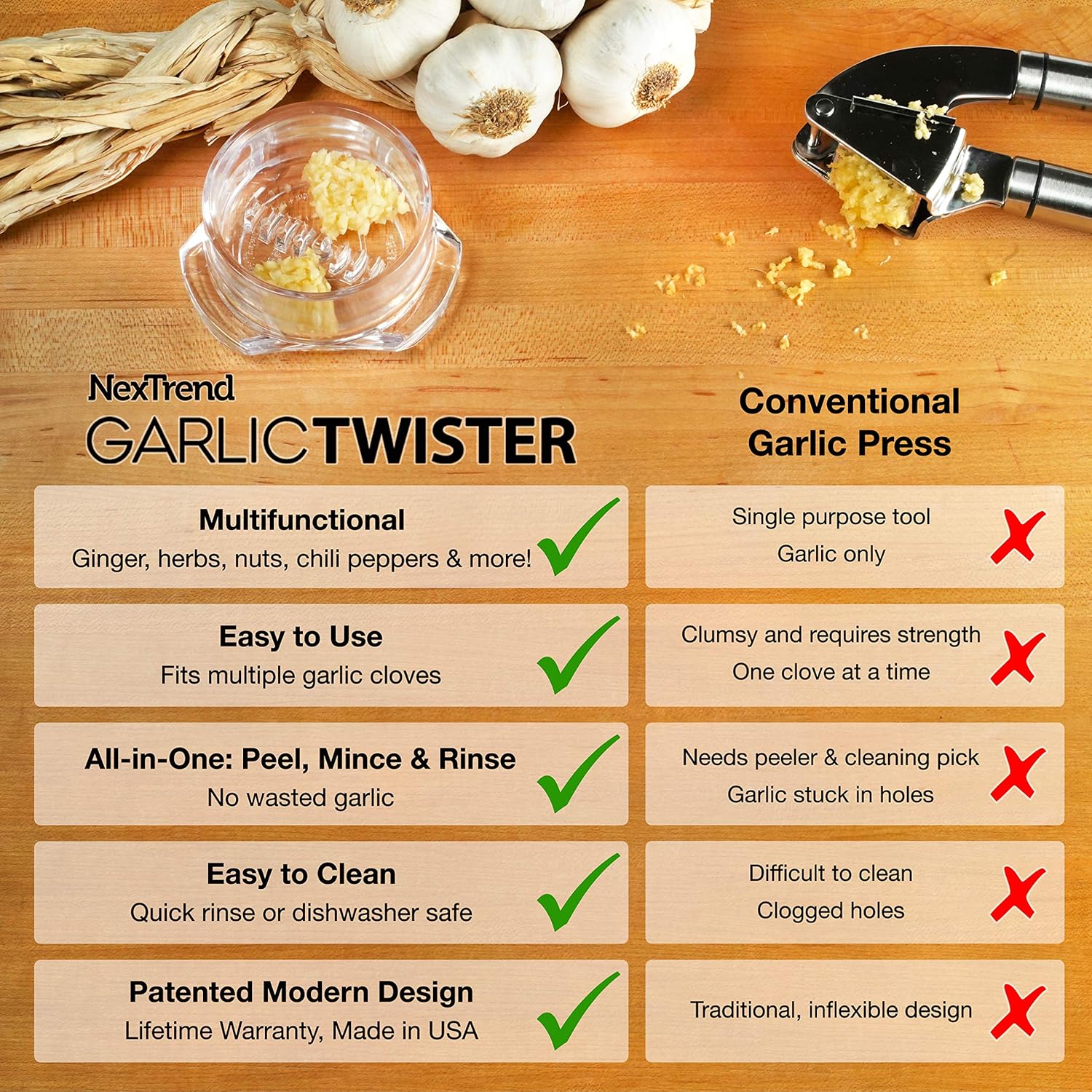 - [ GINGER & MORE ] First slice the ginger into narrow discs before placing into the Garlic Twister. See "Stir Fry" video above for demo. Try it for nuts to top your ice cream! NO MORE messy garlic presses, squashing garlic with rockers, grating, pressing or rolling garlic to peel the skin!