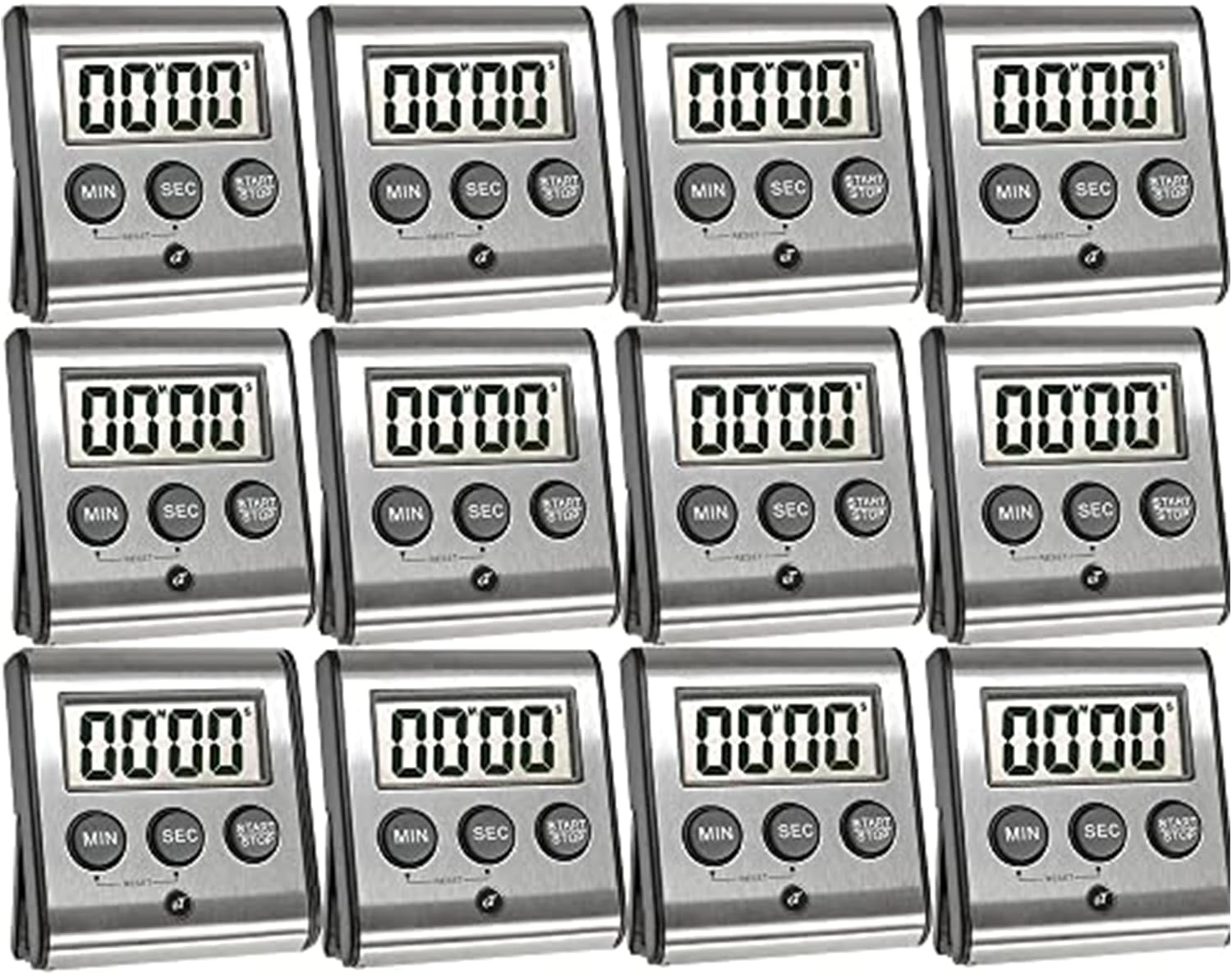 - (12 Pack) 2025 Model: "Great Little Timer" We eliminated the annoying little button beeps every time buttons are pressed. New lanyard attachment feature for hanging timer around neck belt or wrist. Adjustable angle fold-out countertop kickstand. Counts up/down 99 min/59 sec w/ Auto-Memory for repeated tasks. Auto-Memory holds previous setting for the next event. Want 3 min eggs every morning? Set time once and only press start every morning. 3 min. will stay in memory until reset.