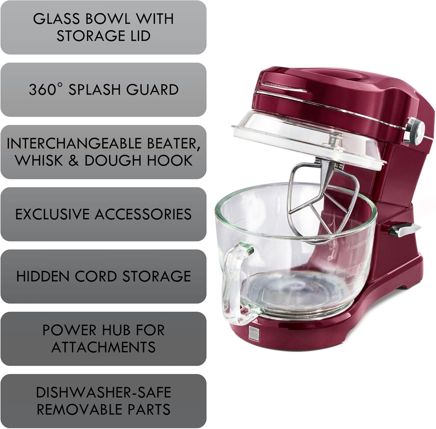 - EXCLUSIVE ACCESSORIES Comes with premium dishwasher-safe accessories including interchangeable flat beater, dough hook and wire whisk; sturdy 5 qt glass bowl with storage lid; and wide-mouth funnel, egg separator, and ingredient grater/zester specially designed to fit the Ovation’s pour-in opening