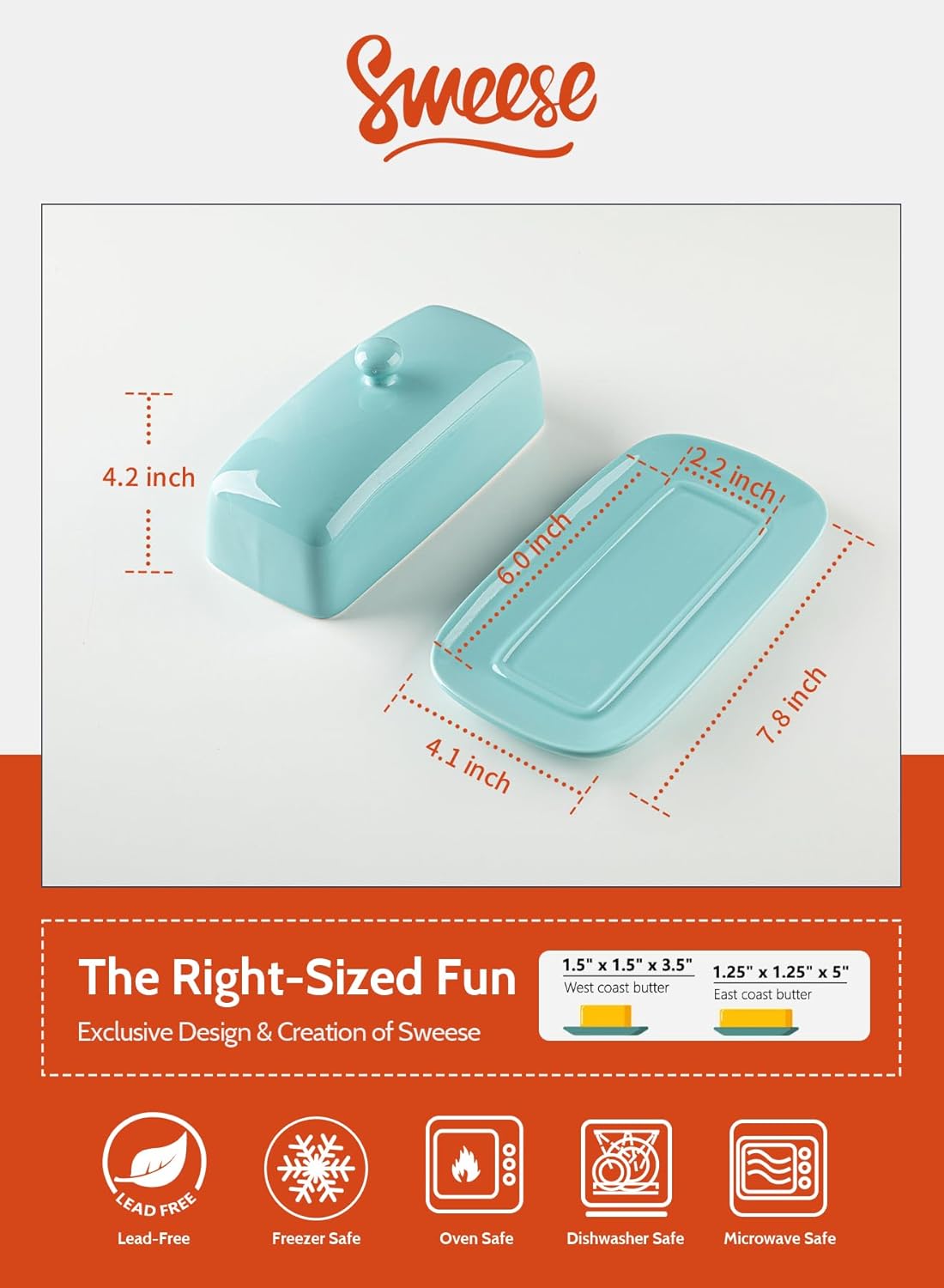 Sweese Butter Dish with Lid, Porcelain Butter Keeper, 7.8 Inch Butter Holder with Handle Cover, Butter Container Perfect for East West Coast Butter, Turquoise
