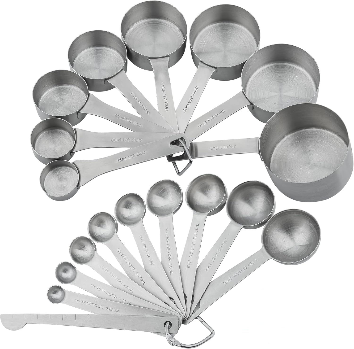 - SET OF 20 MEASURING TOOLS - 8 Measuring Cups: 1 CUP - 240ML<br>3/4 CUP - 180ML,2/3CUP - 160ML,1/2 CUP - 120ML <br>1/3 CUP - 80ML,1/4 CUP - 60ML,1/8 CUP - 30ML<br>1/16 CUP - 15ML,9 MEASURING SPOONS SIZES: <br>4 TEASPOON - 20ML,1 TABLESPOON - 15ML,2/3 TABLESPOON- 10ML<br>1/2 TABLESPOON - 7.5ML,1 TEASPOON - 5ML,3/4 TEASPOON - 3.75ML <br>1/2 TEASPOON - 2.5ML,1/4 TEASPOON - 1.25ML<br>1/8 TEASPOON - 0.63ML; 1 Leveler and 2 RINGS