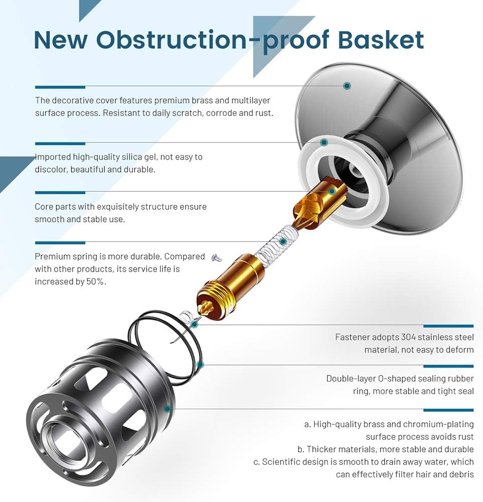 - 【BUILD-IN STRAINER】Unlike regular puch button drain,this drain stopper has a anti-clogging basket strainer inside that neatly collecting hairs and prevents the drain from clogging up,stuff will not get into the drain, such as jewelry, ring, dirt and so on.