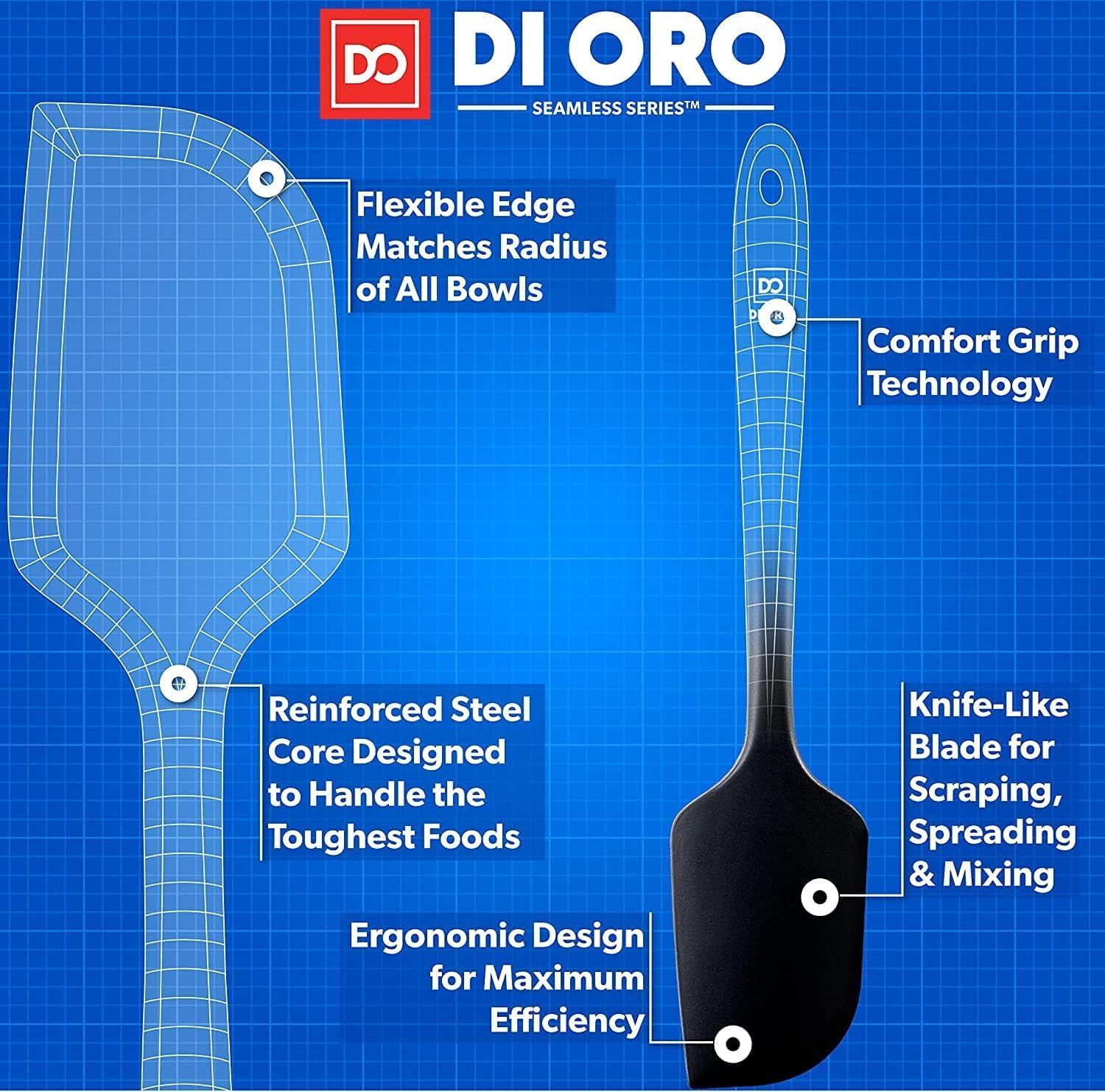 - CLEANS EASY, SEAMLESS ONE-PIECE DESIGN – You will be happy to know that your Award-Winning DI ORO Seamless Series Spatulas are dishwasher safe or can be quickly and effortlessly cleaned by hand. The one-piece seamless silicone design prevents buildup of food and grime, which allows for safe and healthy cooking.