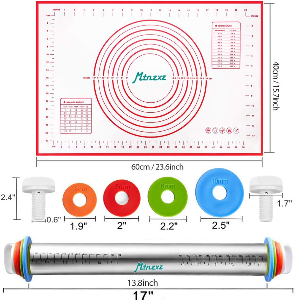 Rolling Pin and Silicone Baking Pastry Mat Set, Stainless Steel Dough Roller, Rolling Pins with Adjustable Thickness Rings, for Baking Fondant, Pizza, Pie, Pastries, Pasta, Cookies
