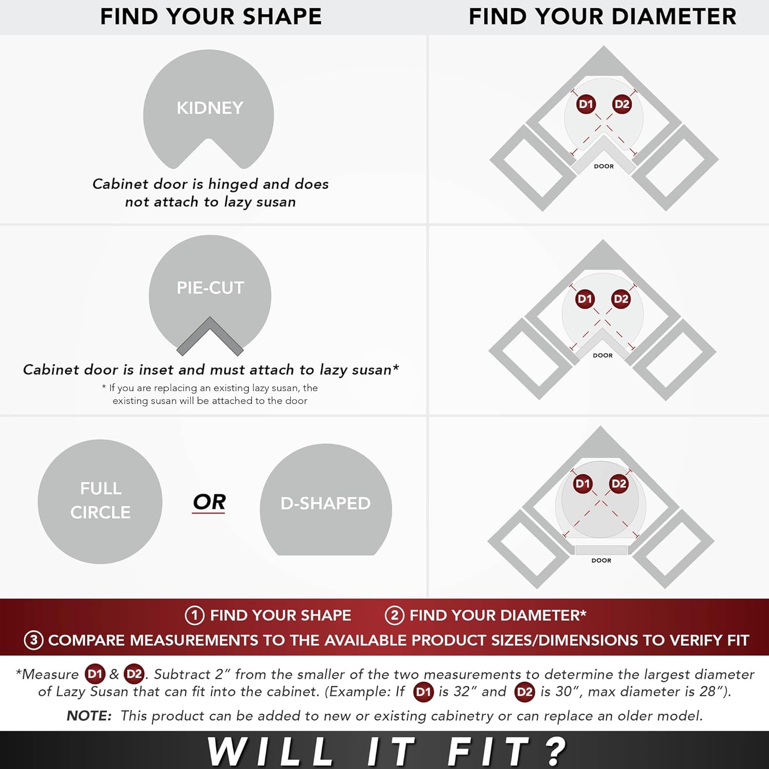 - Pie-Cut 2-Shelf Lazy Susans: Effortlessly organize your space with our Polymer Pie-Cut Two-Tier Lazy Susans for Corner Base Cabinets; dimensions: 28" W x 18.25" D x 26" H; weight per shelf: 68 lb.