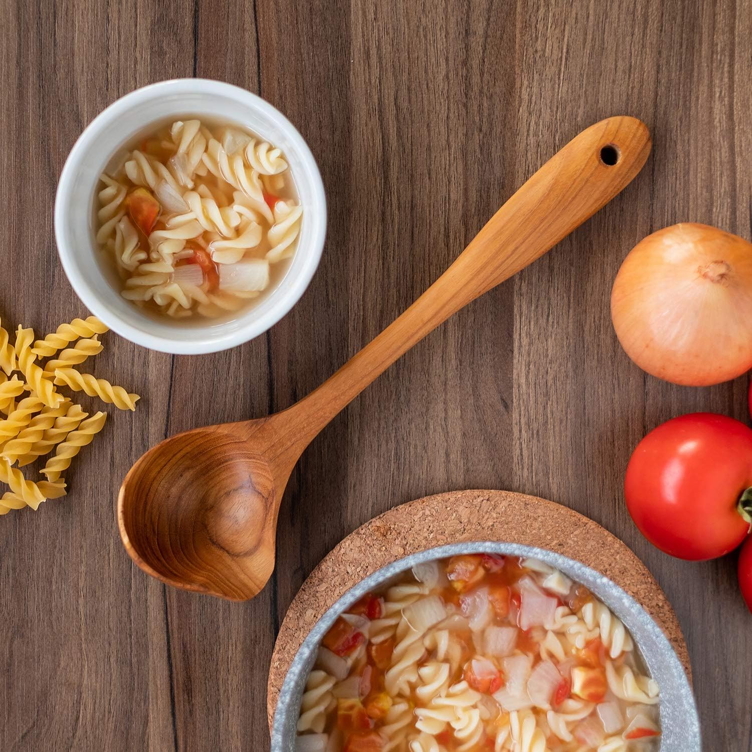 - 100% CAREFREE COOKING EXPERIENCE Our FAAY Teak Duck’s Tail Ladles are made of 100% golden brown teak. Unlike typical ladles, their duck’s tail like spoon makes it easier to taste or pour your soup into the container. The handle is 11" long and comfortable when holding. Teak texture which is durable yet lightweight allows you to stir and serve your food conveniently. The deep spoon is designed to be suitable to hold any kind of food and soup not exceeding 1.3 oz. and suitable for right hand.