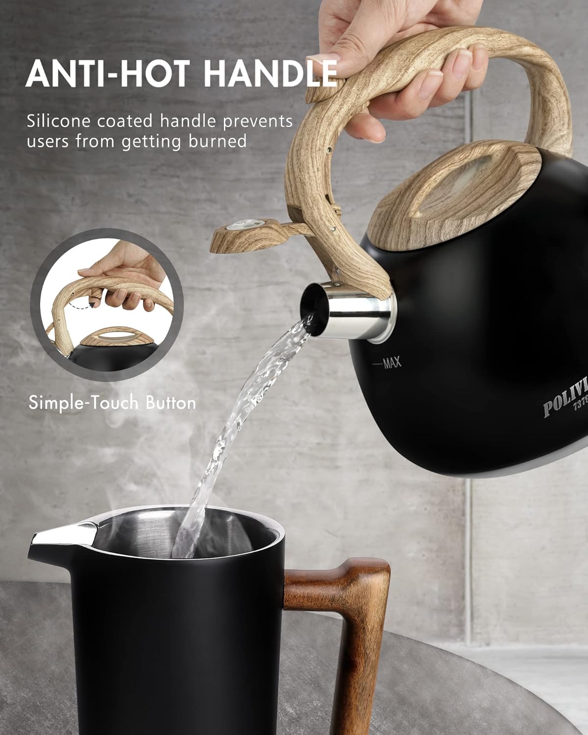 - Anti-Hot Handle - Silicone coated handle allows you to grab the teapot without risking burns. The ergonomic shape maximaze your comfort to lift and pour. Simple touch button provides easy open & close to make one hand pouring possible.