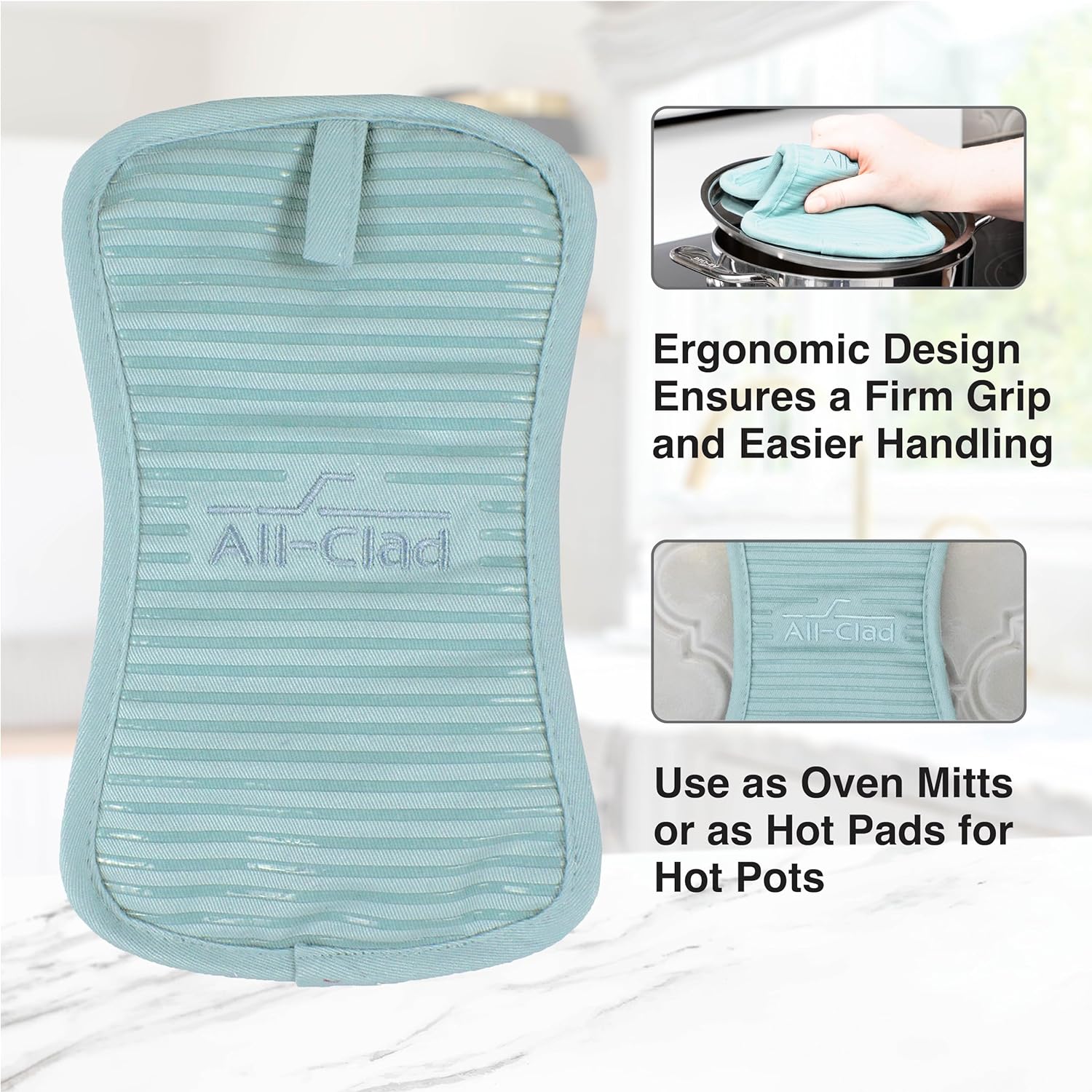 - MAXIMUM HEAT PROTECTION. All-Clad Pot holders with silicone grip offer heat resistance up to 500 degrees Fahrenheit (260 degrees Celsius). Having a reinforced thumb area made of fire resistant fibers means your hands will be protected when grabbing hot items from the oven or grill.