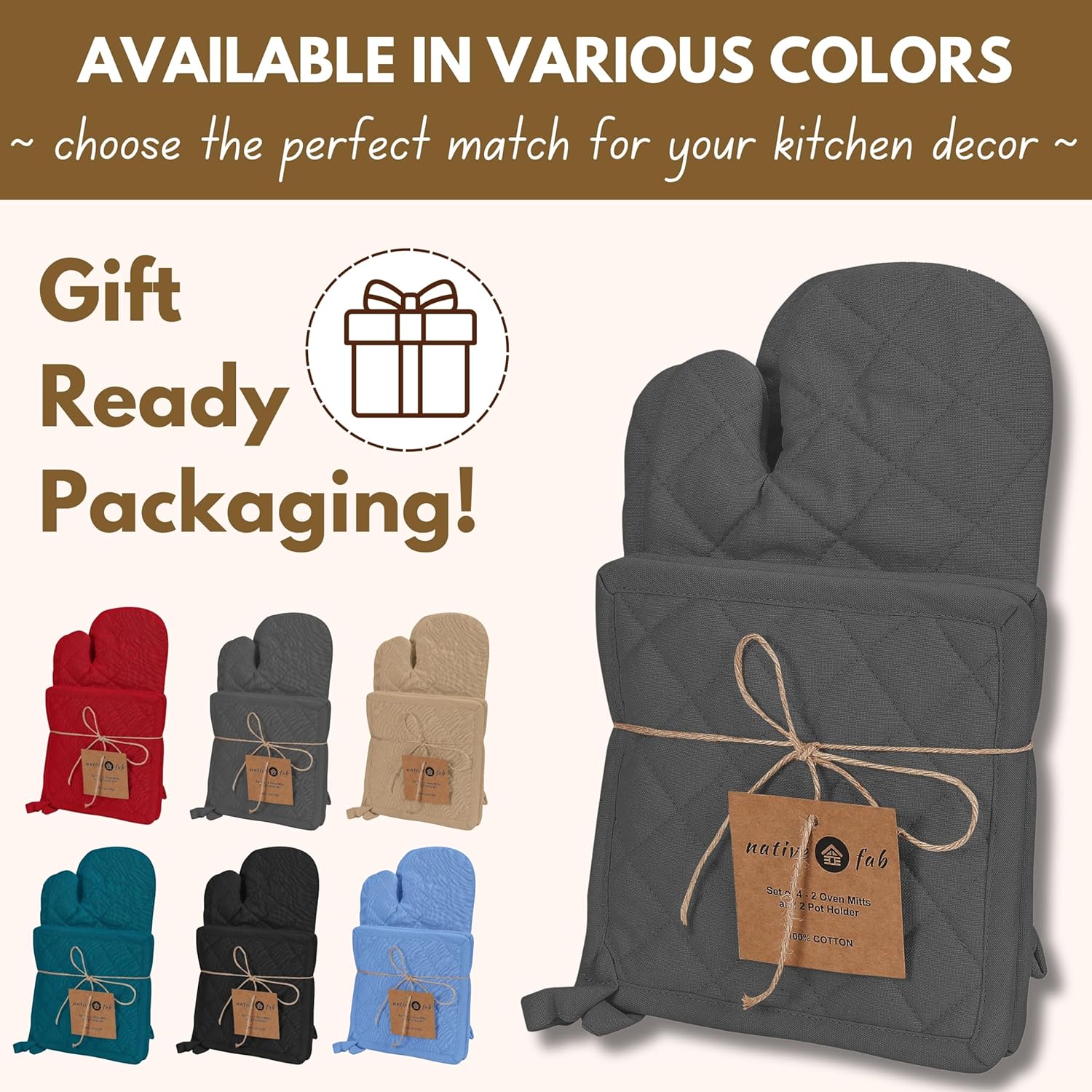 Native Fab Farmhouse Oven Mitts and Pot Holders Set of 4, Heat Resistant Non-Slip Machine Washable, 100% Cotton Kitchen Pot Holders Oven Mitts Sets Grey