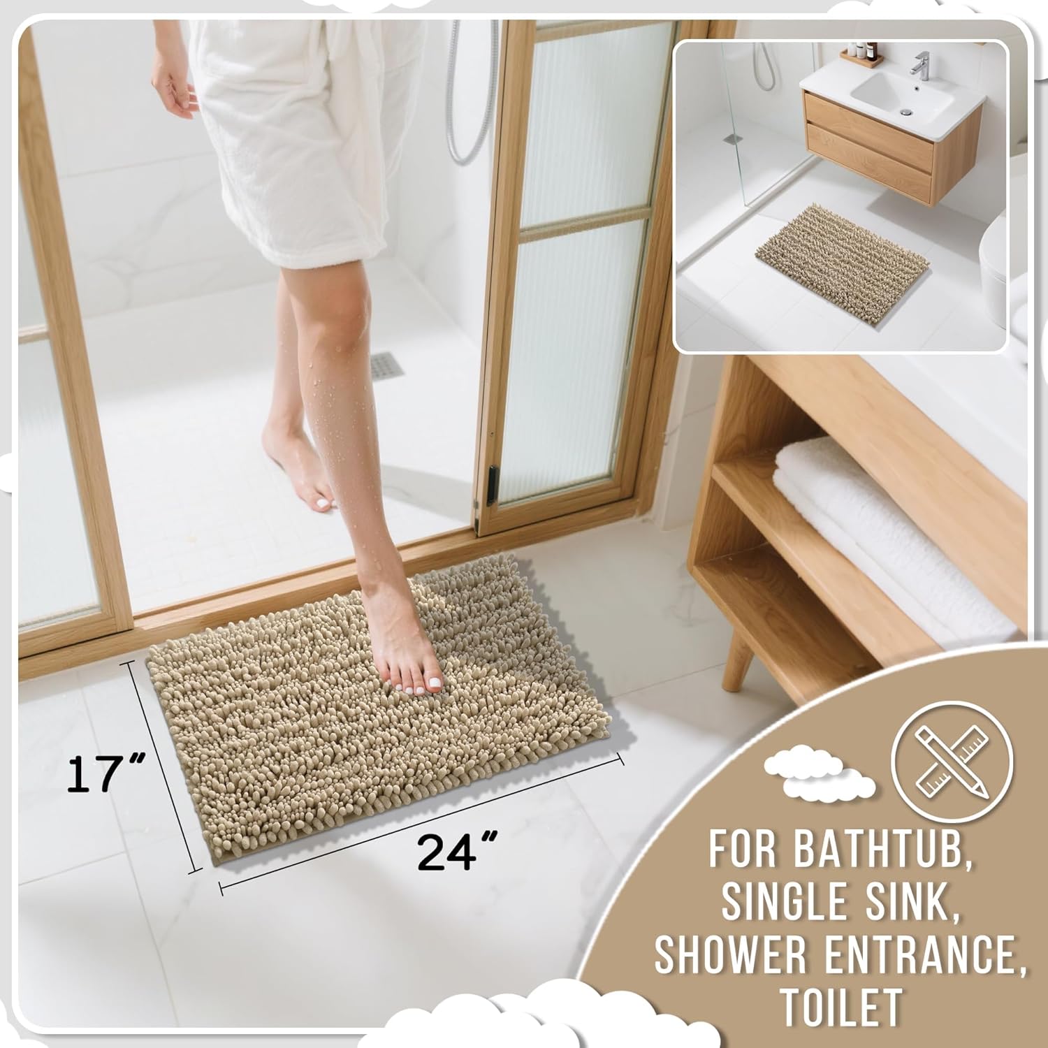 Yimobra Bathroom Rugs Non Slip Washable 24x17 Inch - Ultra Soft Absorbent Chenille Bath Mat, Quick Dry Shaggy Floor Carpet for Tub Shower, Pale Khaki Home Decor Accessories