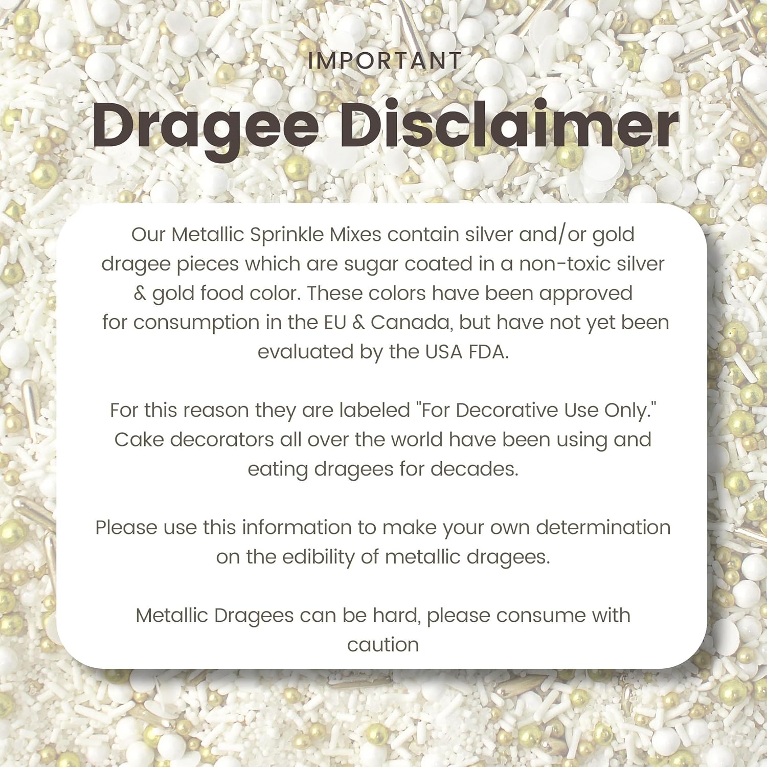 - Metallic Dragees Disclaimer: Silver and gold dragees are commonly used by cake decorators worldwide. While approved for consumption in some regions, they are traditionally labeled as โFor Decorative Use Onlyโ in the U.S. Please use discretion when adding them to your creations