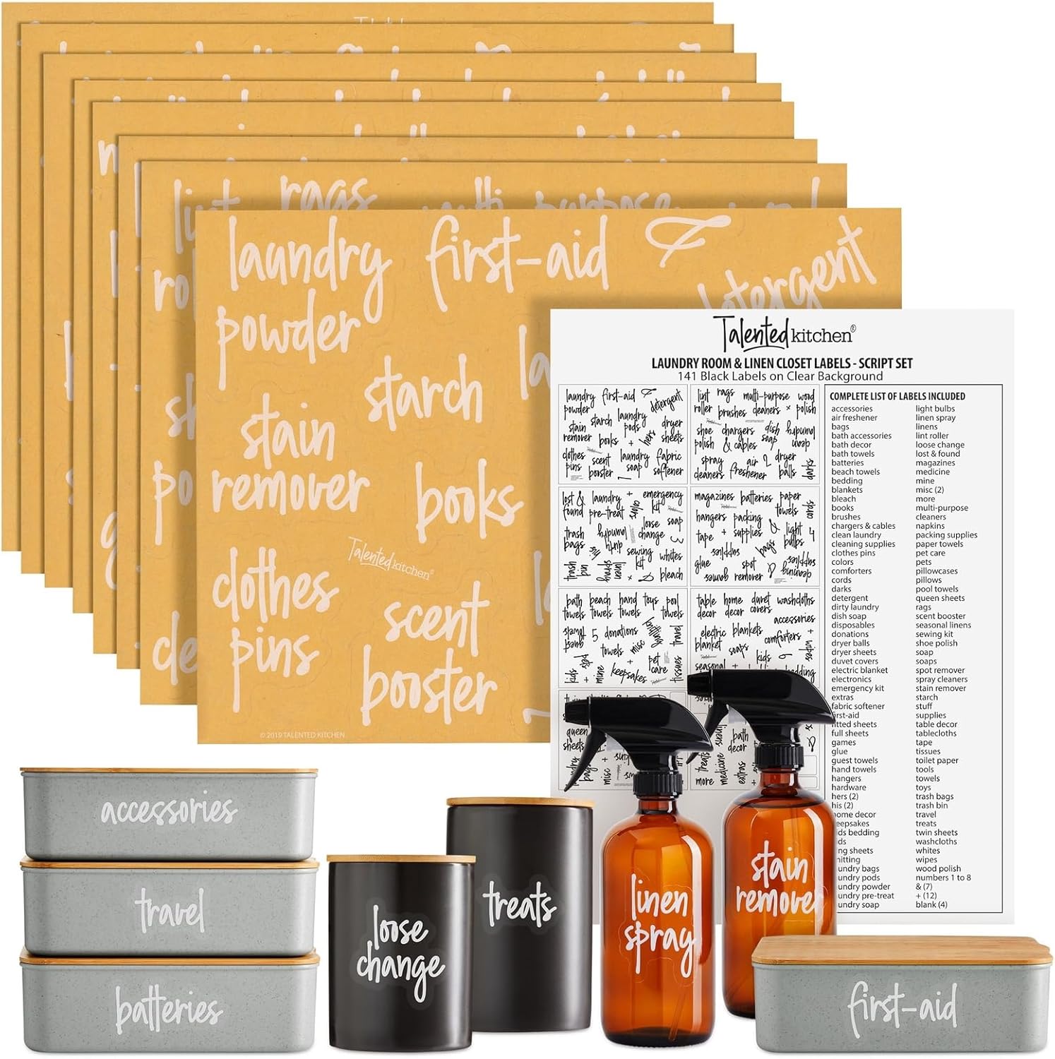 Talented Kitchen 141 Laundry Labels for Jars, Containers - Preprinted White Script Stickers for Linen Closet, Bathroom, Cleaning Supplies Organization, and Laundry Room (Water Resistant)