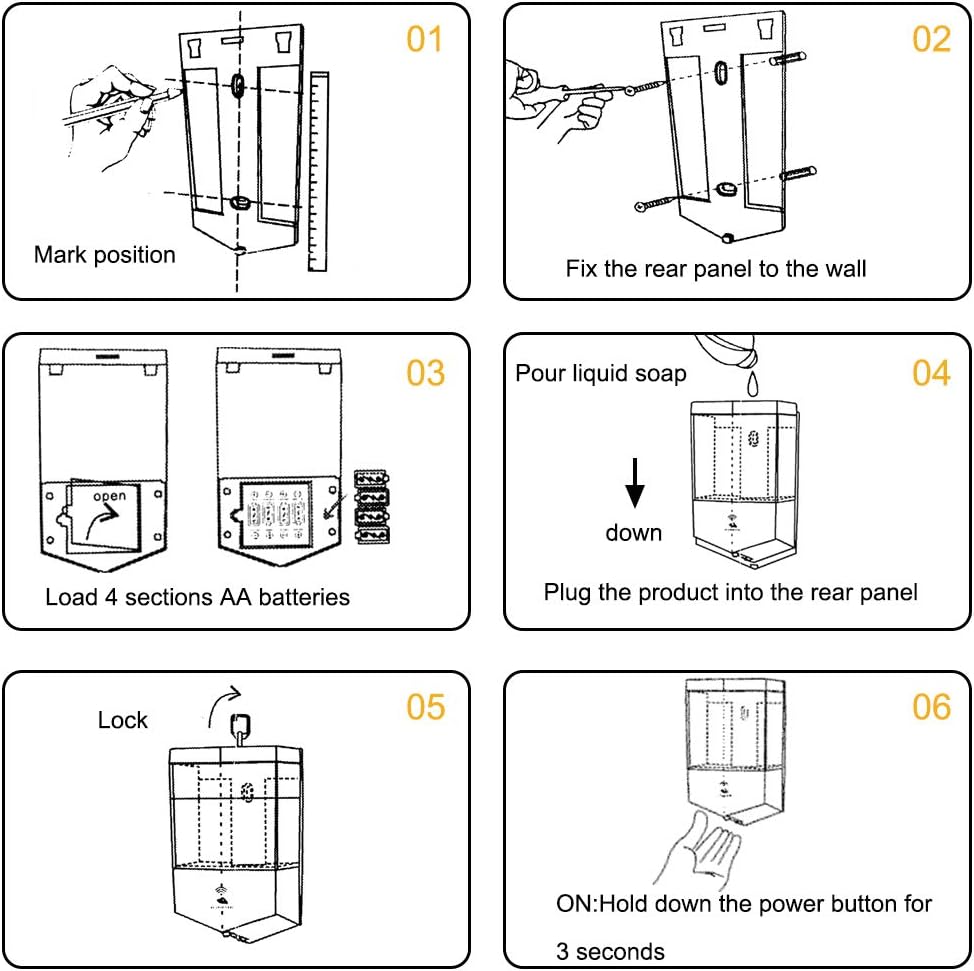 - Wall Mounted Soap Dispenser--- High quality and made of ABS and saving space. Capacity: 20.3oz/600ml, Size: 4.5in*3.2in*7.7in. 4 x AA Batteries(Not included). Make sure the height for dispenser to countertop should be 8 inch to 12inch. (Note: Not provide stickers, need drilling install on the wall. )