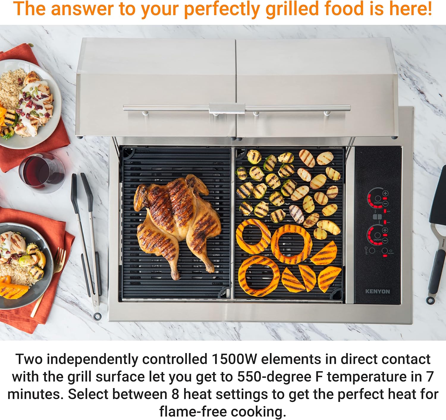 • Quick Heat-Up: The grill has two independently controlled 1500W elements in direct contact with the cooking surface letting you get to 550-degree F temperature in 7 minutes. Select between 8 heat settings to get the perfect heat for flame-free cooking.