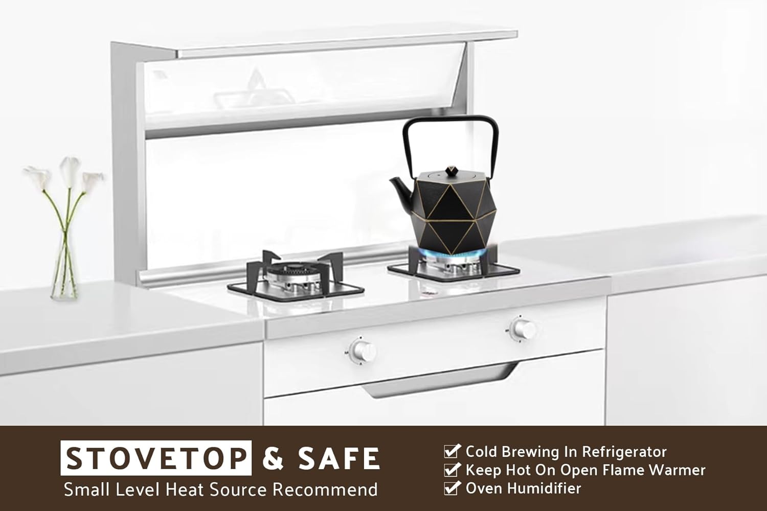- π Tea Kettle for Stovetop - The cast iron tea kettle is sturdy and protects the teapot from shattering, which is more sturdy than the general glass/ceramic teapot. The fully enameled interior helps to taste the original and delicious tea. HEAT SOURCE: Induction Cooker, Electric Stovetop, Ceramic Stove Top, Gas Stovetop Safe, As a Humidifier Wood Burning Stove, Halogen Cooker, Fireplace for Humifying Moisture in the Air. Note: Low heat/Moderate heat is suggested, PROHIBITION OF DRY BURNING.