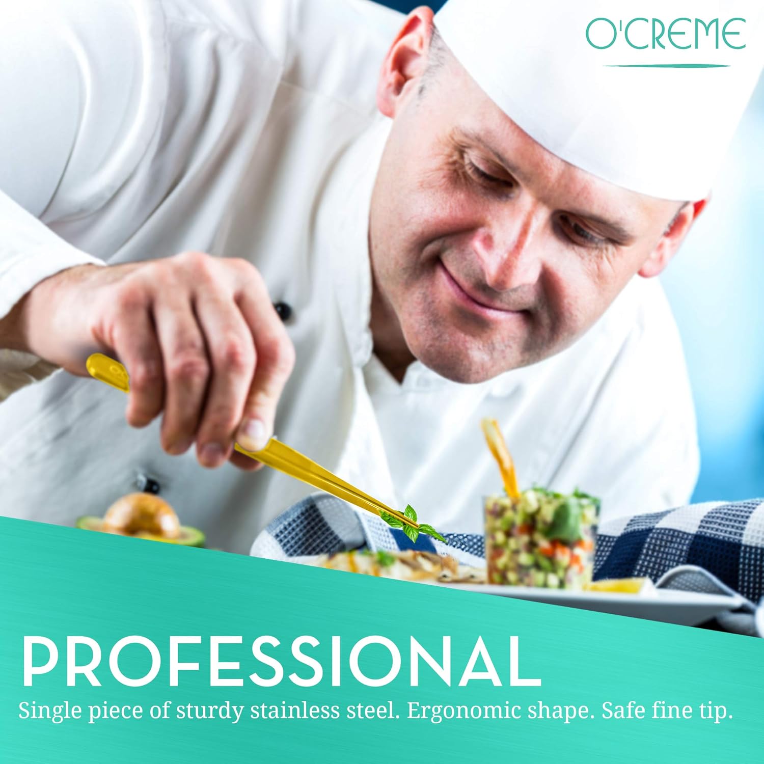 - Essential kitchen tool built from a single piece of sturdy stainless steel with comfortable ergonomic shape and tip extra fine but blunt enough to be safe to touch, with firm hold on food to keep it from sliding out of tweezers; glossy metallic-colored eye-catching food-safe exterior to add color to your kitchen or to serve as reminder to use only for specific foods, whether chicken or meat or fish or salad; tweezers delivered with soft plastic ring holding tips together