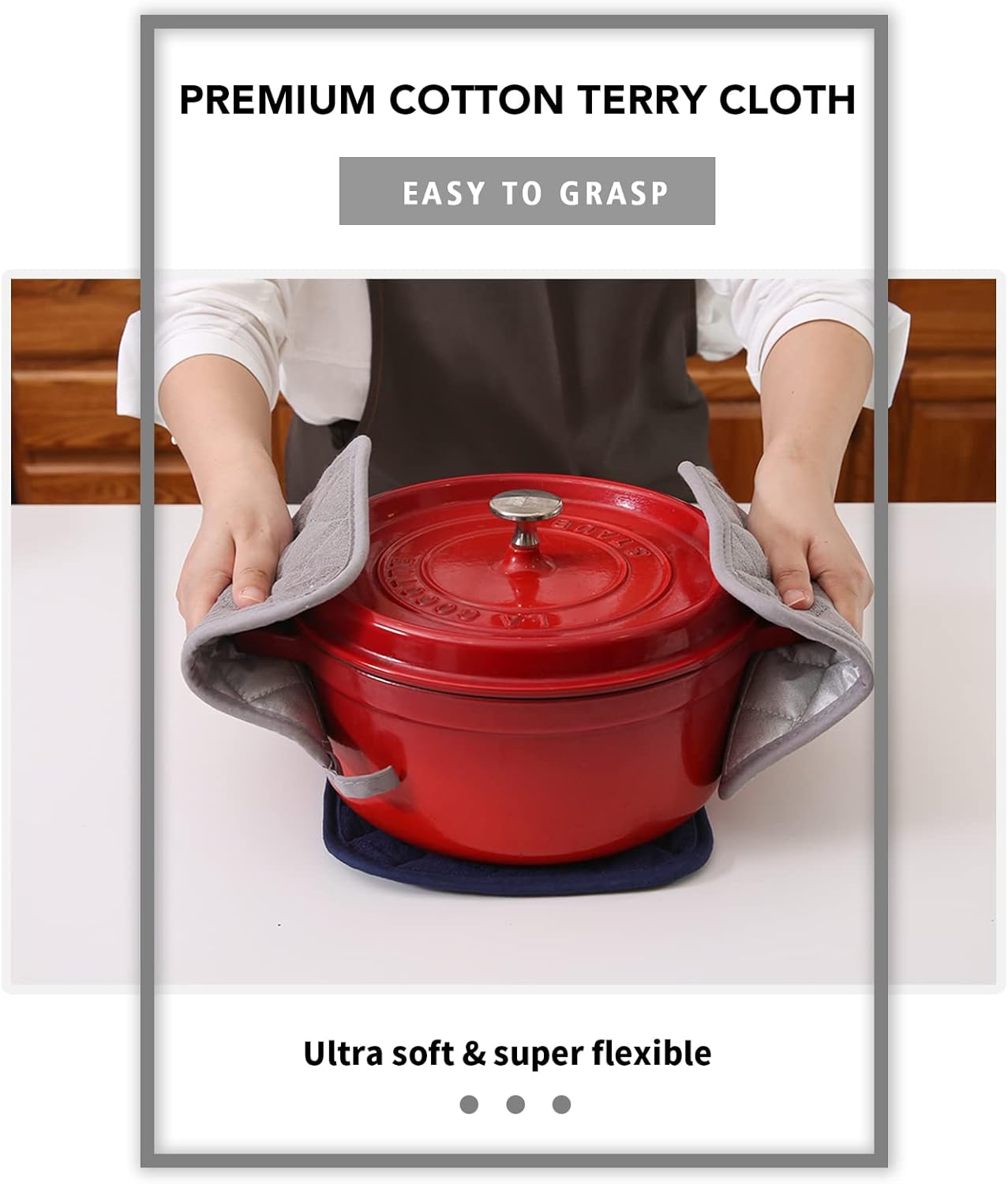- QUILTED AND PADDED - Heat resistant up to 400 degrees allowing safe removal of baking dishes and cast iron from the oven and hot pots from the stove.