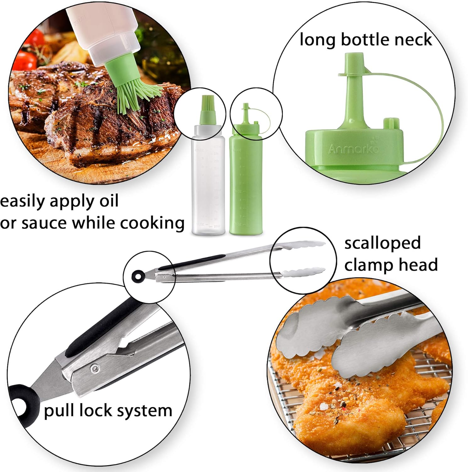 - ✅ PROFESSIONAL STAINLESS STEEL SPATULA SET - includes 1 x cooking spatula turner, 1 x grill spatula, 1 x grill tongs, 2 x squeeze bottles with silicone brush lid.