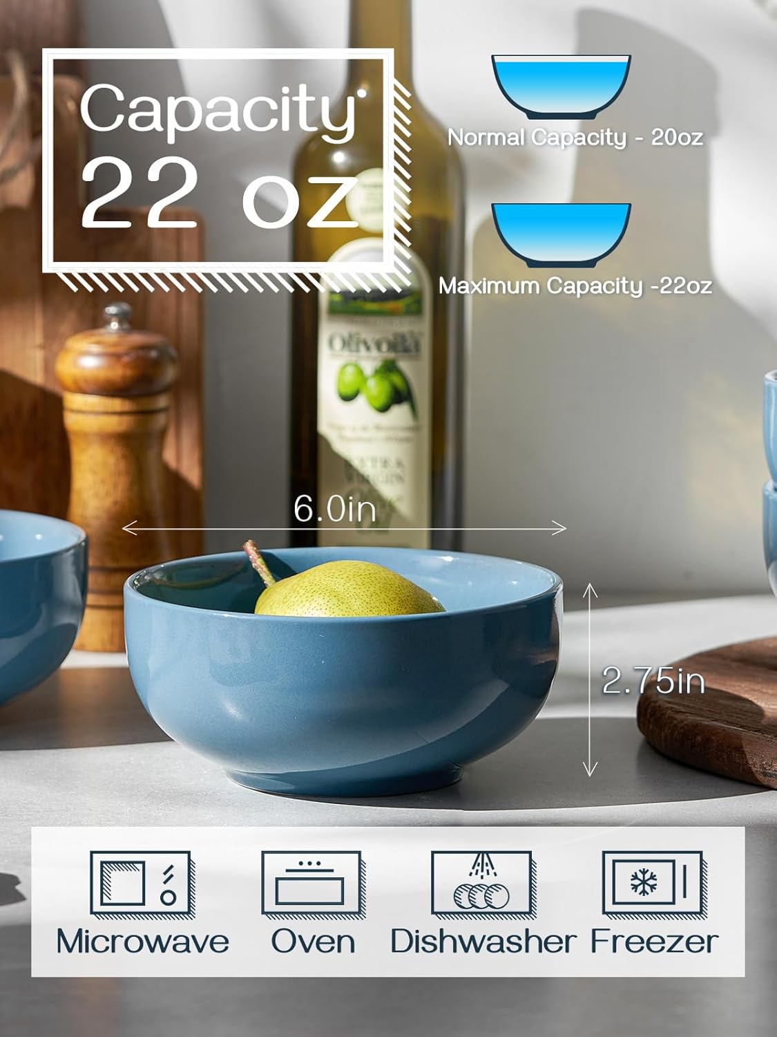 DOWAN 22 OZ Ceramic Soup Bowls & Cereal Bowls - 6" Classic Bowls Set of 4 for Soup, Cereal, Oatmeal, Fruit, Rice - Dishwasher & Microwave Safe (Airy Blue)