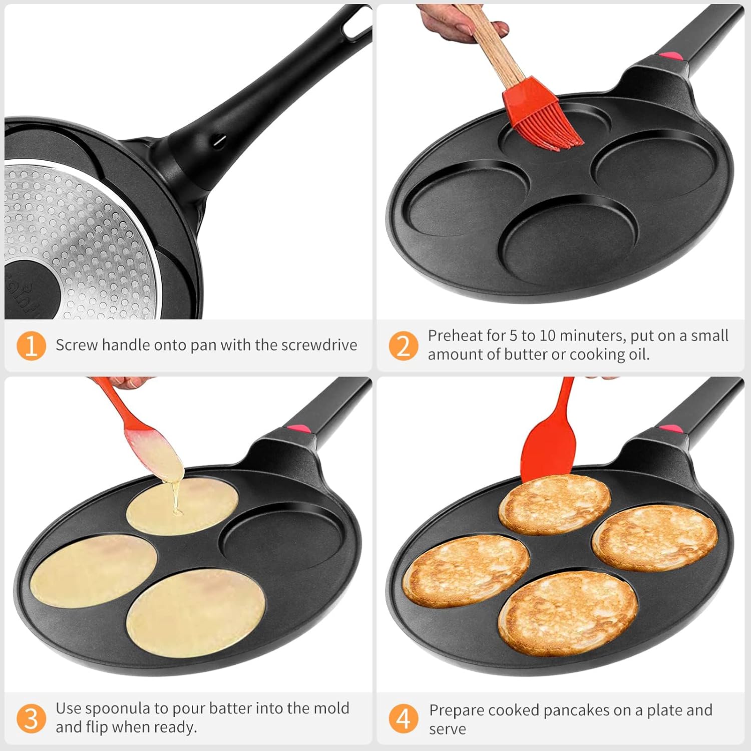 Pancake Pan Nonstick-Suitable for All Stovetops & Induction Cooker, 10.5 Inch Mini Silver Dollar Grill Blini Griddle Crepe Pan, 4 Molds Cake Egg Skillet, 100% PFOA Free Coating