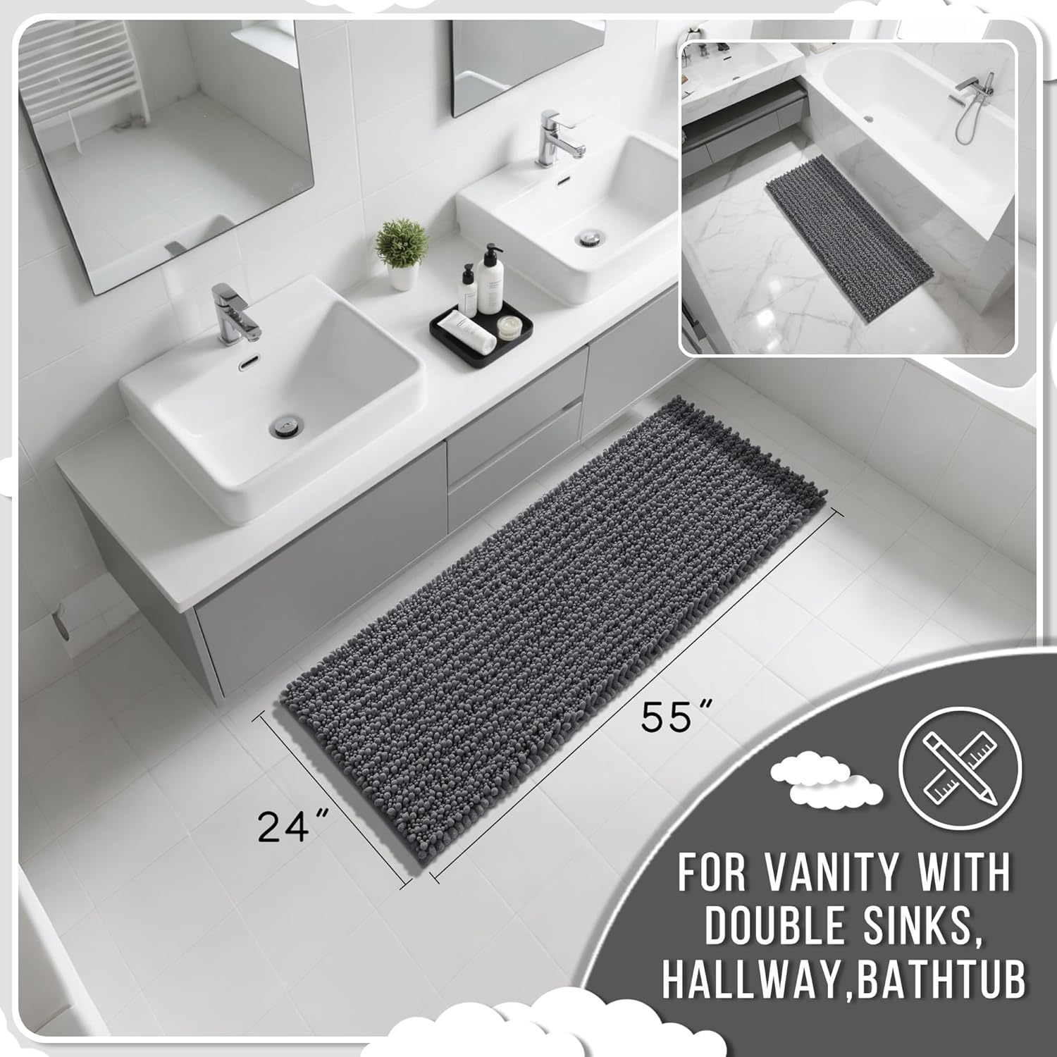 Yimobra Bathroom Runner Rug 55x24 Inch - Extra Long Non Slip Chenille Bath Mat, Soft & Absorbent, Machine Washable Shaggy Hallway Carpet for Vanity Tub Shower, Dark Gray Home Decor Accessories