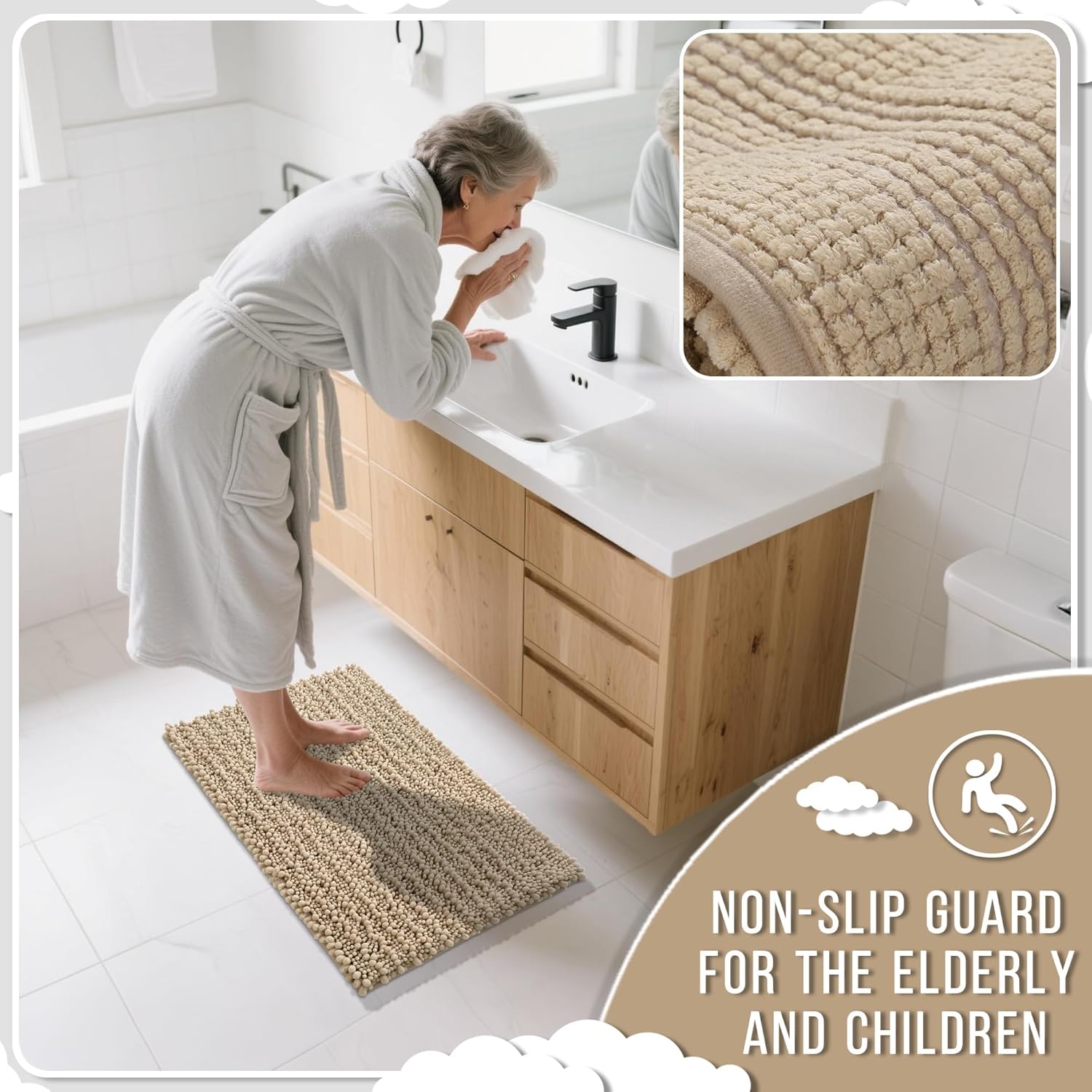 - Ultimate Cloud-Like Soft Comfort: Experience walking on clouds with our extra thick chenille bathroom mat! The ultra plush high pile density cradles your feet, banishing cold tiles after showers. It is perfect for adding warmth to any bathroom floor, transforming routine steps into luxury moments