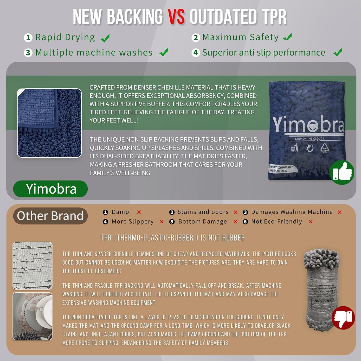 - Total Grip Safety & Quick Dry: Yimobra bath rug features a feather-light yet ultra-grippy hot-melt backing that stays firmly in place on wet surfaces. Its vertical air-channel chenille fibers ensure rapid and complete dryness, providing instant dry safety the moment you step out of the shower. The product is tested for harmful substances, performance, longevity, and emissions in accordance with the OEKO-TEX Standard 100