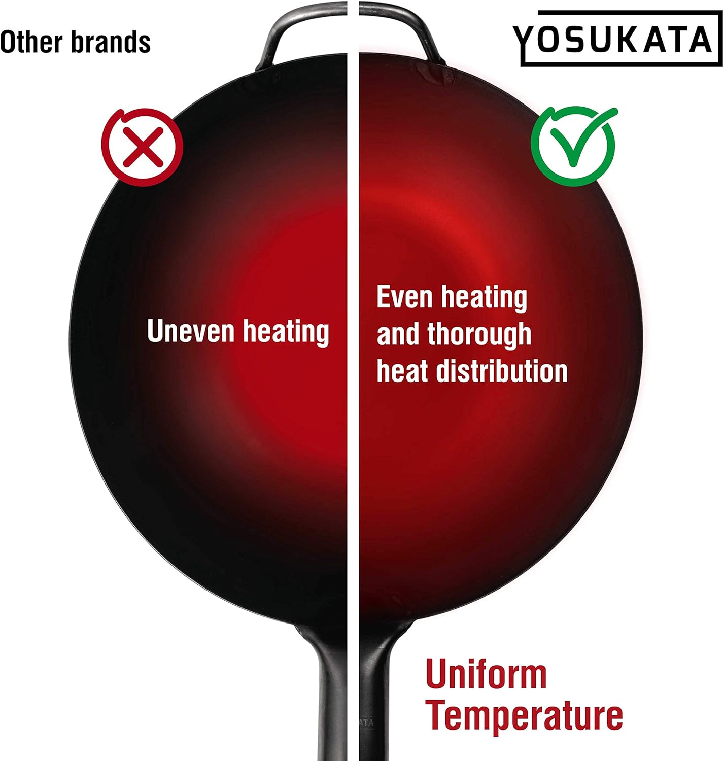 - GENUINE TASTE: Bring authentic wok flavor to your kitchen or outdoor cooking with the YOSUKATA 11.8” flat-bottom carbon steel wok. Designed to lock in juices and flavors, this deep wok pan is ideal for preparing Chinese, Japanese, Thai, and other Asian dishes — the perfect fried rice pan for home or professional use.