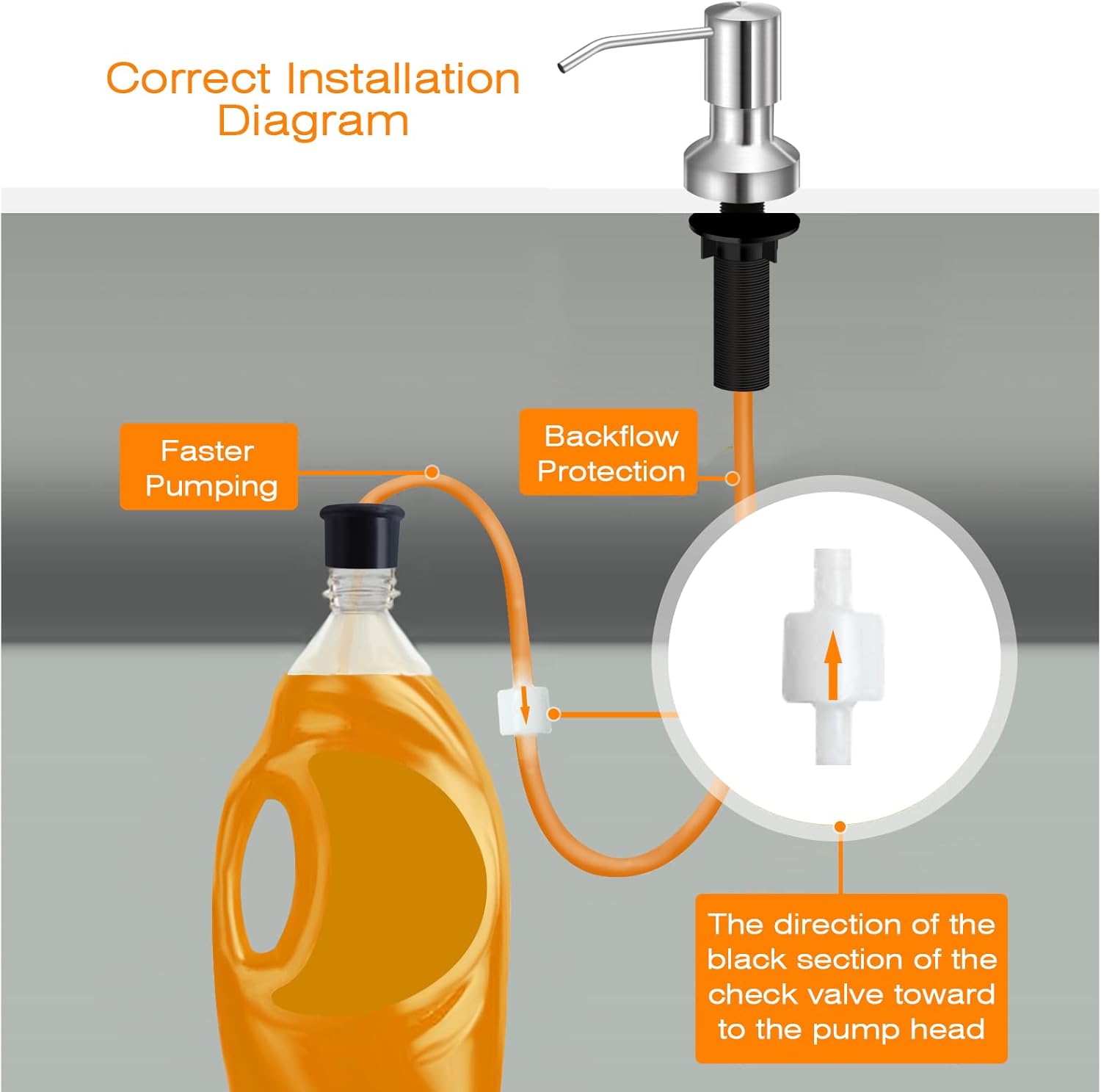 - Premium Quality & Durable: The kitchen sink soap dispenser is made of 304 stainless steel and premium quality PE plastic. Multi-layered brushed nickel finish makes it rust proof, so it has higher durability and reliability. Food-Grade silicone tube is soft and elastic, not easy to bend under the countertop, the check valve make the soap prime in the tube.