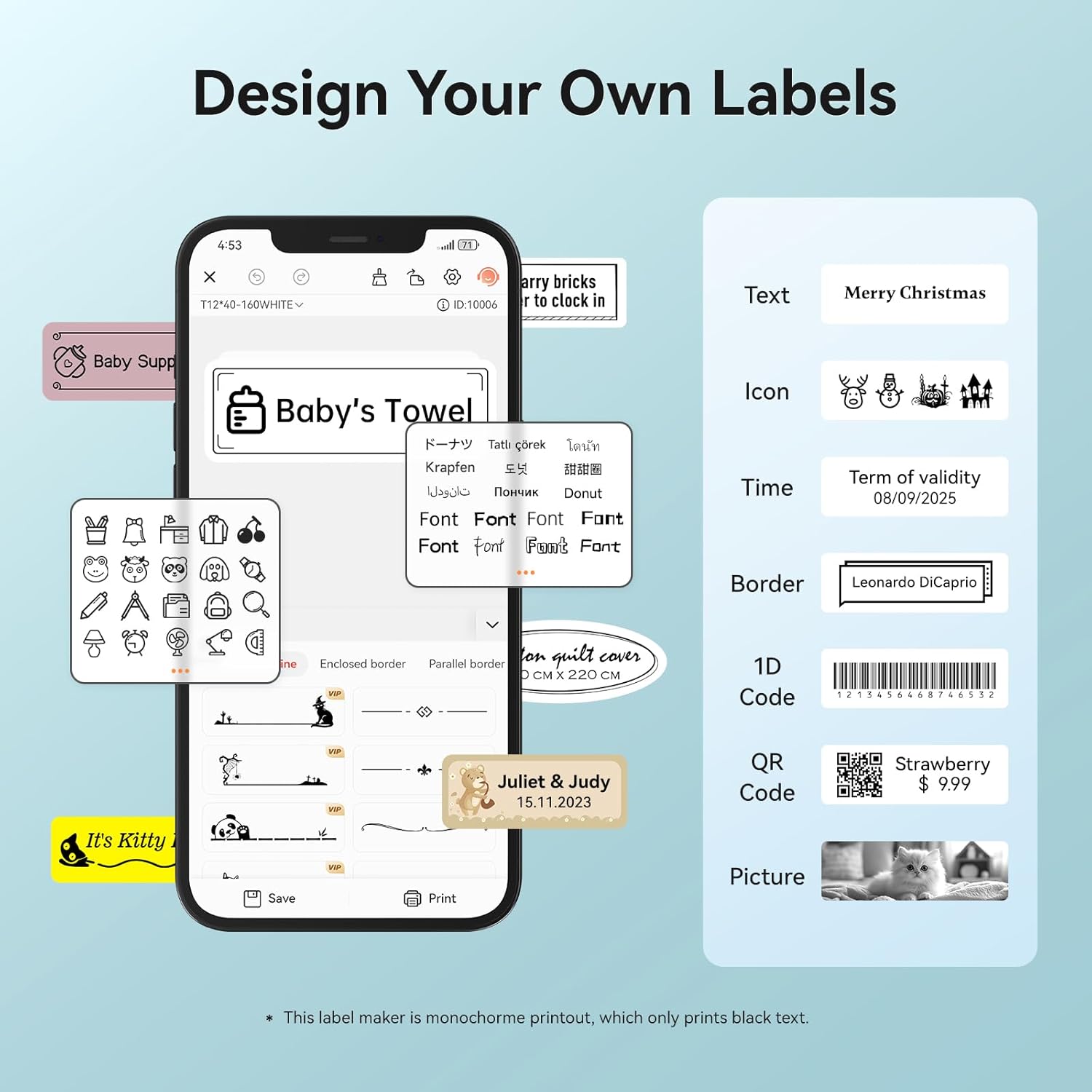 - 【Powerful Functions】It is support to print various texts, numbers, graphics, symbols, logos, barcodes, QR codes,etc. And intelligent recognition of voices and pictures.