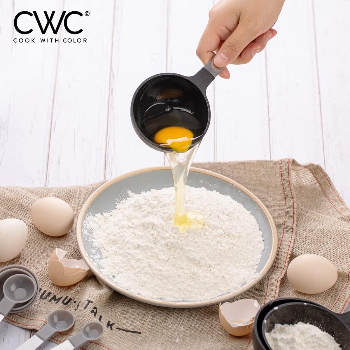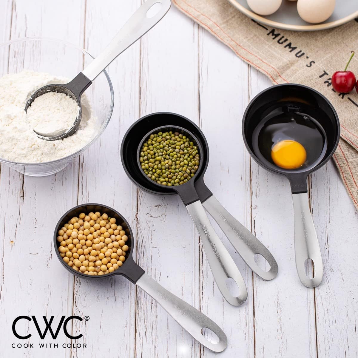 - Cook with Color's set of measuring cups and spoons, a part of our black and white collection, will bring a pop of color to your recipe prep with an easy to use measure set with all the basics still intact.