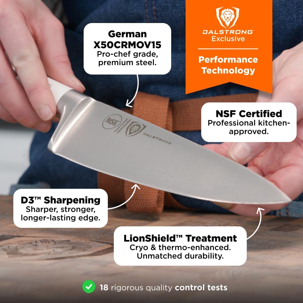 - Premium Materials and Quality Feel: Incredibly razor sharp, this full-tang knife is made from imported high-carbon German steel with a hand-polished edge at 16-18 degrees per side, making it essential for any steak knife block. Rated at 56+ Rockwell hardness, it features a satin finish and is stain-resistant. With a renowned design and satisfying heft, the luxury ABS polymer handles are triple-riveted for a comfortable grip—perfect for busy kitchens and any knife block with knives.